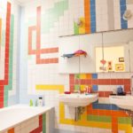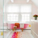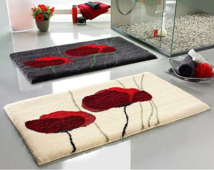 Pour diluer les jeux de couleurs dans la salle de bain, des tapis de différentes couleurs et formes aident.