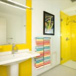 - Vanguard préfère les contrastes. À l'intérieur de la salle de bain, les couleurs des plans verticaux et horizontaux diffèrent les unes des autres. Pour combiner les couleurs dans la salle de bain dans le style spécifié, il convient d'utiliser une combinaison de teintes pures: blanc avec vert, noir, rouge ou jaune.