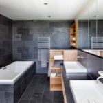 - Une salle de bain décorée de carreaux émaillés noirs semble très chère et à la fois stricte et élégante. Surtout si vous ajoutez des spots disposés en rangée le long du plafond à l'intérieur, décorez les murs avec des écrans de miroir et concevez une zone de lavage avec un grand miroir articulé avec rétro-éclairage. Un contraste attrayant avec le noir créera un ton rouge, blanc et orange. Le design monochrome est relaxant. Cette conception est souvent utilisée pour les salons de spa.