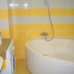 Une petite baignoire d'angle n'est pas pratique pour installer un équipement de formes familières. Le plus, c'est qu'il n'y a pas de coins coupants. Dans ces chambres, mettez généralement une douche, des baignoires arrondies compactes avec hydromassage. Des salles de bains similaires sont prévues dans un appartement ou une maison fumante avec des pièces plus larges de fonctionnalités similaires, où vous pouvez déjà vous déplacer plus librement. En conséquence, la sélection des schémas de couleurs doit refléter la combinaison de deux pièces séparées, créer une sorte d'ensemble.