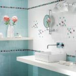- La couleur turquoise est délicate et vivifiante. Il donne naissance à des souvenirs de la mer, crée de la fraîcheur, de la fraîcheur. Il a un effet calmant. Le fond turquoise de la salle de bain est associé à du blanc neige, ce qui contribue à la création d'un tandem harmonieux.