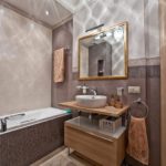 - Couleur marron. La salle de bain dans cette conception est confortable, il est agréable d'y rester longtemps. Le ton de bois brun provoque une sensation de chaleur. Les concepteurs conseillent de décorer la baignoire avec un ton brun clair en combinaison avec d'autres couleurs pour éviter la morosité et la gradation.