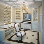 Cela devrait être la personnification de l'élégance mélangée au chic des aristocrates. L'élément principal autour duquel le reste est construit est la salle de bain. Le classique de la décoration dans cette conception de la salle de bain doit soutenir tout le concept du conçu et ne pas se superposer aux détails modernes.