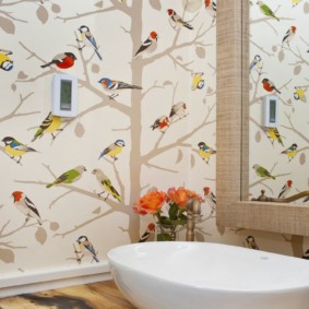 Une alternative dans la salle de bain sans la présence de carrelage sur les murs sera le papier peint. Ces papiers peints sont traités avec une imprégnation spéciale hydrofuge, ce qui les rend adaptés au placement dans les salles de bains. En cas de contamination, la surface est facilement nettoyée à l'aide de produits chimiques spécialisés. Si nécessaire, ce papier peint peut être changé pour une autre option avec une couleur ou un ornement plus lumineux avec un effort minimal.