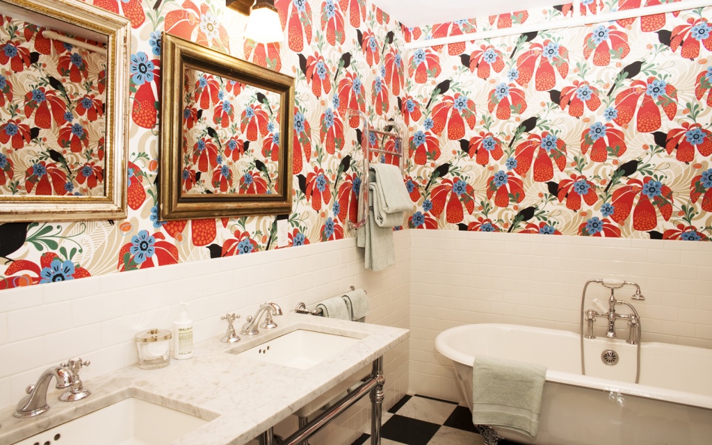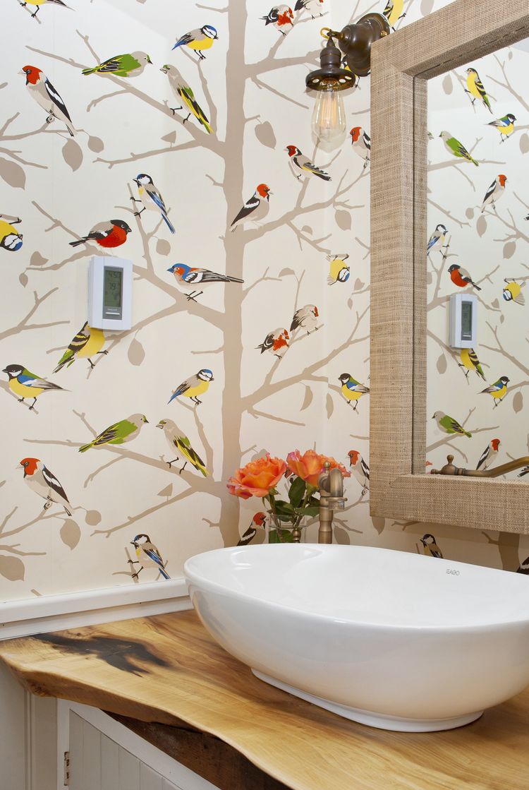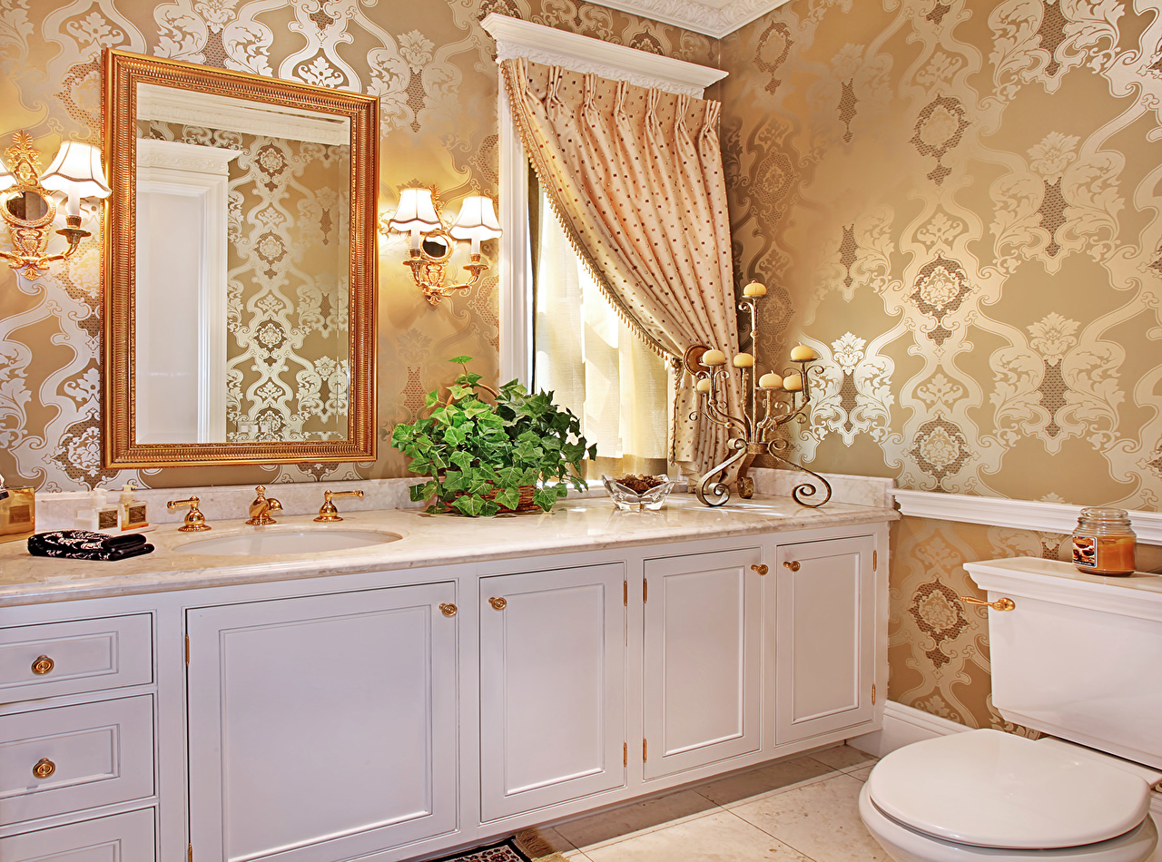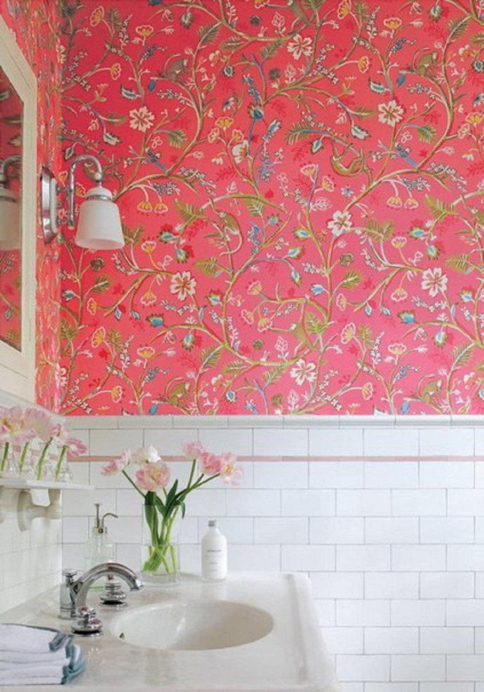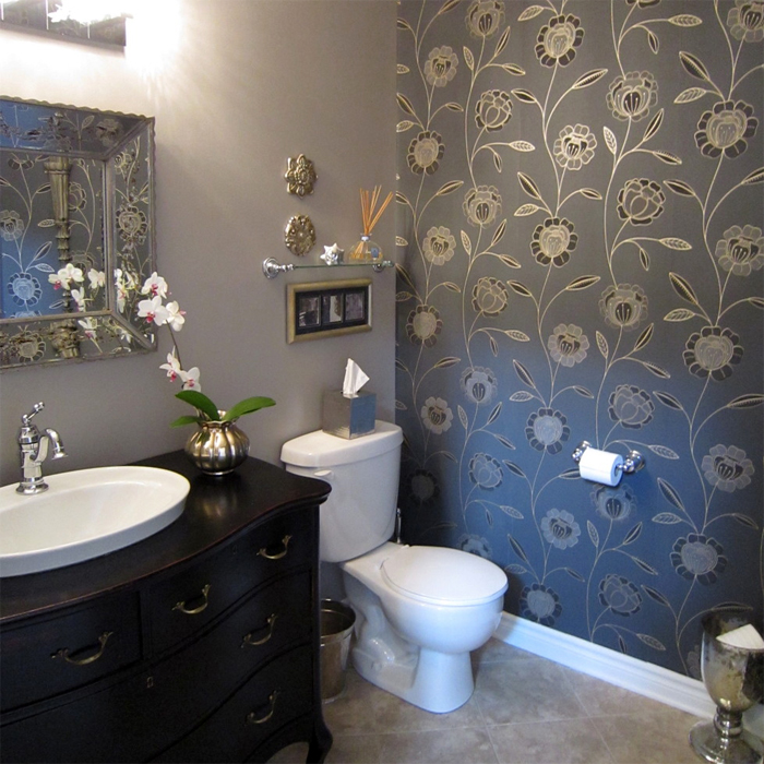 Une alternative dans la salle de bain sans la présence de carrelage sur les murs sera le papier peint. Ces papiers peints sont traités avec une imprégnation spéciale hydrofuge, ce qui les rend adaptés au placement dans les salles de bains. En cas de contamination, la surface est facilement nettoyée à l'aide de produits chimiques spécialisés. Si nécessaire, ce papier peint peut être changé pour une autre option avec une couleur ou un ornement plus lumineux avec un effort minimal.