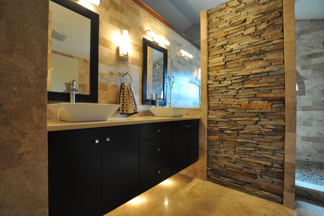 La pierre est parfaite pour mettre en valeur le mur d'accent à l'intérieur de la salle de bain