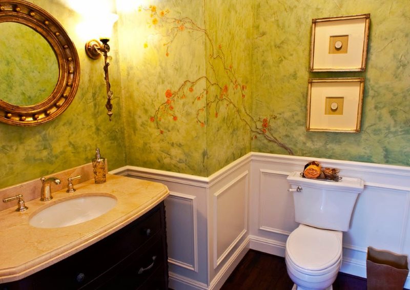 Enduit décoratif en haut du mur et doublure en plastique en bas - une solution populaire pour une salle de bain de style ethnique, en Provence ou à la campagne