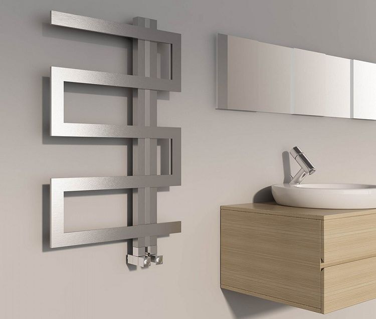 - Acier inoxydable. De tels porte-serviettes chauffants dans la salle de bain (voir photo) sont durables, ont une conductivité thermique élevée, résistent aux processus de corrosion, sont disponibles dans une large gamme. Pour les options d'eau, il est nécessaire de sélectionner des modèles avec une épaisseur de paroi de 2 mm ou plus.