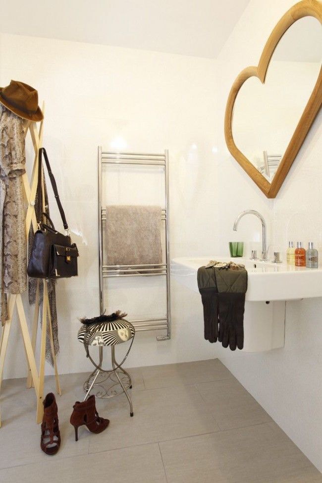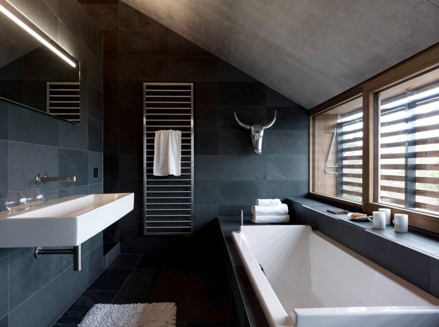 Le porte-serviettes chauffant à l'intérieur de la salle de bain comme sur la photo doit s'adapter au style et en même temps remplir ses fonctions. Les produits modernes sont disponibles sous différentes formes: