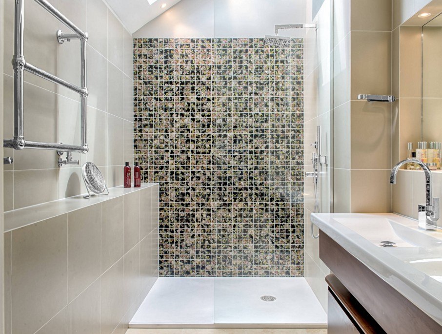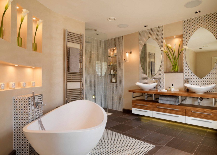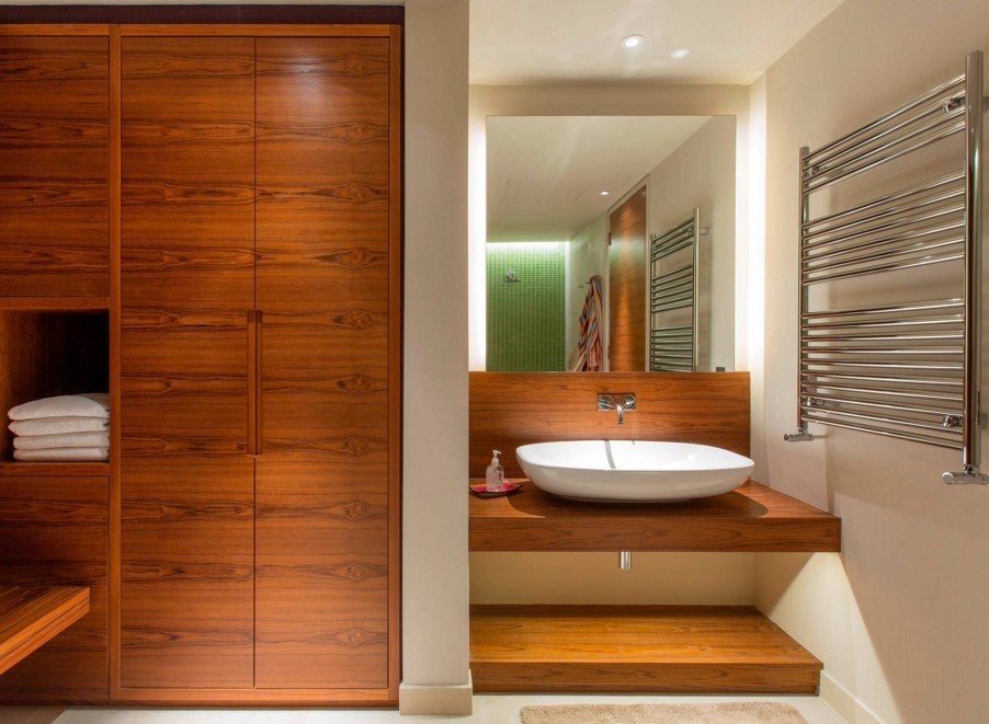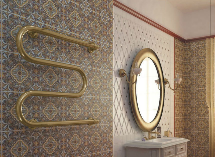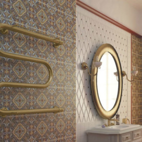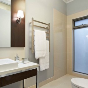 Des porte-serviettes chauffants modernes à l'intérieur de la salle de bain sont également un ajout stylistique à la conception globale. Mais les grandes dimensions ne permettent pas toujours de le placer dans de petits appartements (Khrouchtchev par exemple).