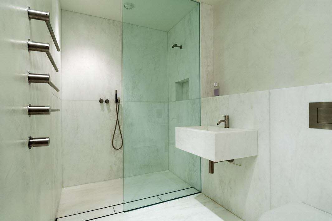 La partie inférieure est souvent coulée, en béton, face carrelé. Dans ce cas, l'étanchéité est très importante pour éviter les fuites et l'accumulation. de l'eau sur espace douche. Aussi palette peut être en céramique ou en acrylique, mais dans de tels cas, l'élévation est souvent en béton.