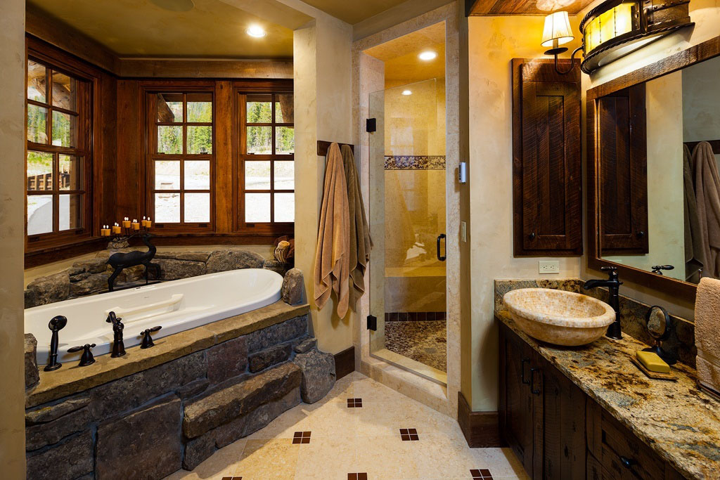 Salle de bain de style chalet alliant bois brut et charme français sophistiqué