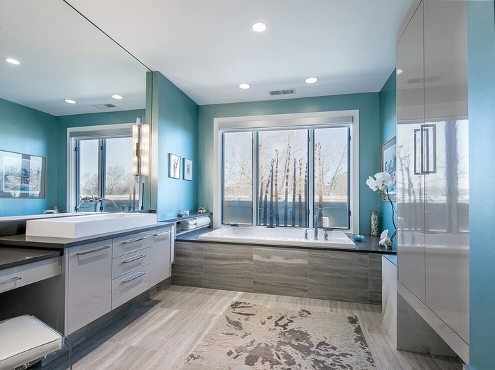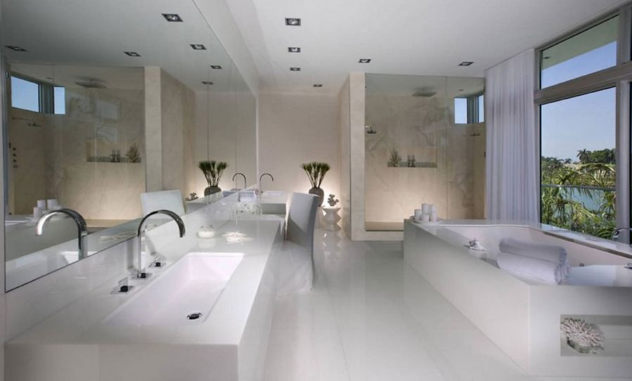 L'intérieur d'une grande salle de bain nécessite de la réflexion en tout. Le jeu de couleurs joue ici un rôle important. Les tons clairs, dont la base est le blanc, conviennent le mieux à cette pièce. Et la présence de surfaces brillantes soulignera la pureté et le luxe des couleurs claires. Diluez la base claire avec des détails sombres ou contrastés pour compléter logiquement l'image.