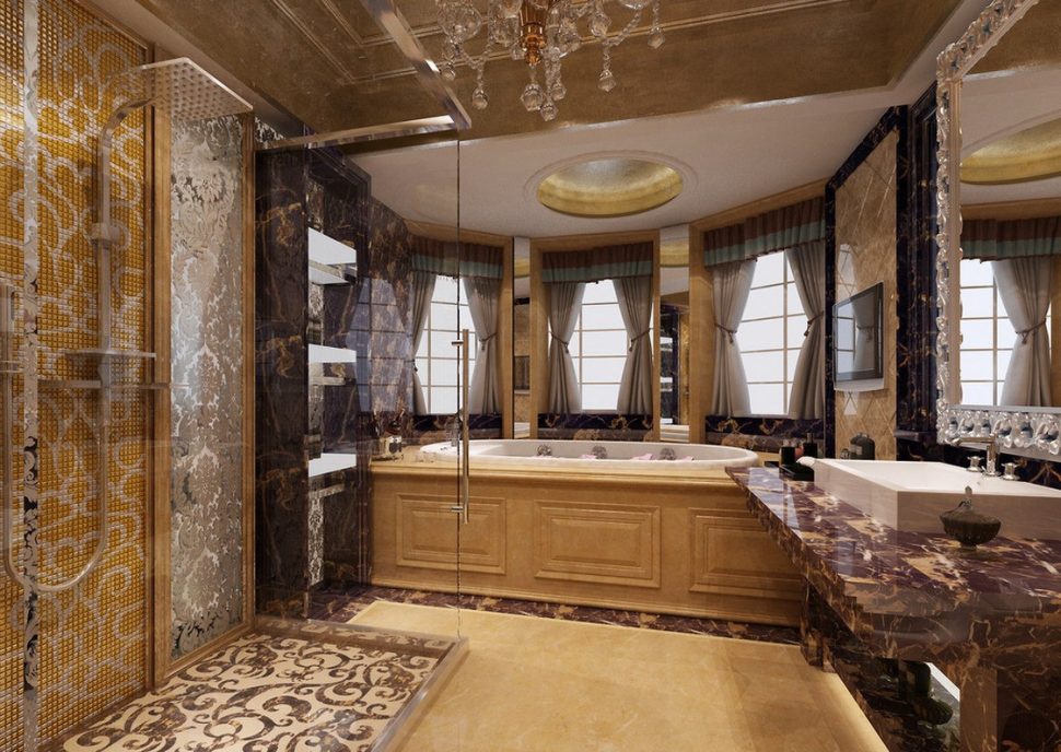 L'aspect luxueux du marbre donne à la salle de bain spacieuse un aspect noble et royal. La seule nuance est son coût élevé. Par conséquent, il est souvent utilisé pour les comptoirs et l'attribution de zones individuelles.