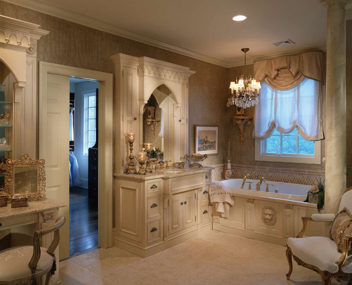La grande baignoire d'angle peut être équipée d'une voûte de style ancien à colonnes.