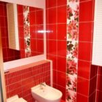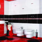 Les carreaux rouges et noirs sont utilisés avec une utilisation suffisante de blanc dans la conception de la pièce, sinon beaucoup de tons sombres, même en pleine lumière, surchargeront votre salle de bain et lui donneront un aspect sombre.