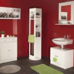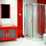 - La salle de bain rouge et blanche (photo) est plus adaptée aux petites pièces dans un style minimaliste et un thème oriental. Si vous aimez le rouge, utilisez-le principalement dans des accents vibrants tels que la couleur des meubles et de la plomberie. La combinaison de rouge et de noir est généralement complétée ou ombragée par des inserts et une décoration avec des inserts en argent et en or.