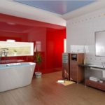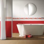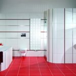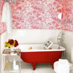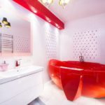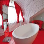 Monochrome - pour ceux qui ont une pièce à part entière de grande taille avec des fenêtres et de hauts plafonds, seulement de cette façon, vous ne réduirez pas visuellement l'espace et ne mettrez pas en valeur le style original. Dans ce cas, la conception peut alterner les couleurs primaires des murs, du plafond et du sol dans différentes versions. Par exemple - beaucoup de rouge sur les murs rayés avec de la plomberie blanche et blanc neige, des meubles. Vous pouvez maintenant choisir la plomberie de n'importe quelle couleur. L'essentiel dans la conception d'une baignoire rouge et blanche n'est pas d'aller trop loin avec des teintes rouges et de choisir les bons appareils d'éclairage qui mettront en valeur votre décision audacieuse.