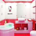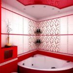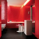 Moderne - une caractéristique de ce style, une combinaison de contrastes. Les coins carrés et tranchants dans les combinaisons de couleurs rouge, blanc et noir sur le sol sont complétés par des motifs et des ornements sur les murs. Des carrés et des rectangles rouges sur les murs combinés avec une mosaïque classique au sol et des bordures noires. Ici, vous pouvez expérimenter des combinaisons non seulement de couleurs, mais aussi de formes de meubles, de plomberie et d'accessoires. Dans ce mode de réalisation, il devrait y avoir de nombreux appareils d'éclairage qui sont installés sur les murs sous la forme d'appliques et le plafond sous la forme de nombreuses LED. Une telle solution conviendra aux personnes excentriques et dynamiques qui aiment la vie dans toutes ses manifestations.