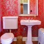 Anglais - un décor classique combiné avec du luxe, adapté aux pièces d'une petite surface, lorsque vous prenez des armoires, des miroirs et de la plomberie dans des tons rouges avec l'ajout d'or à l'intérieur aux tons blancs et pastels de la surface totale de la pièce. Il sera agréable de compléter l'ensemble de la composition avec des lampes en cristal, ce qui ajoutera du charme supplémentaire à votre intérieur. S'il y a une fenêtre dans votre baignoire, des rideaux blancs avec des fleurs rouges et des franges dorées feront l'affaire. Un bon ajout serait quelques peintures sur le mur avec de la peinture anglaise.