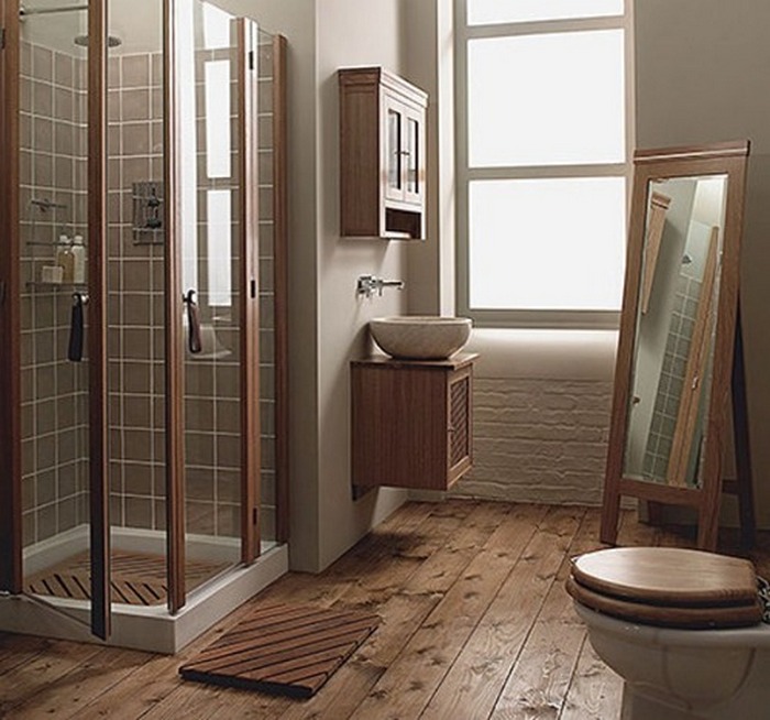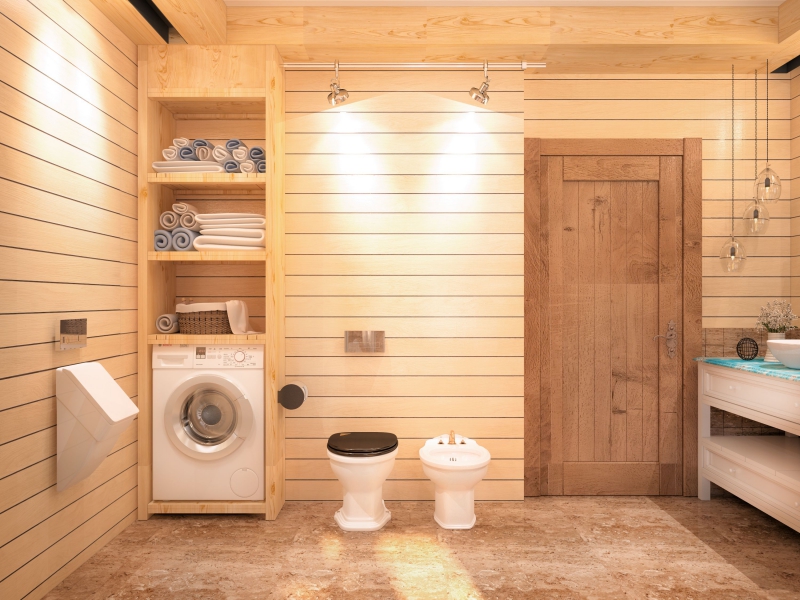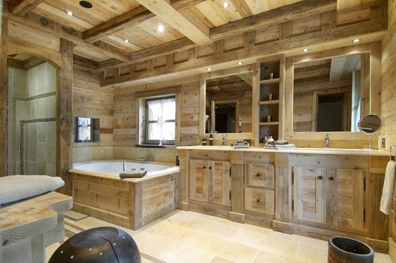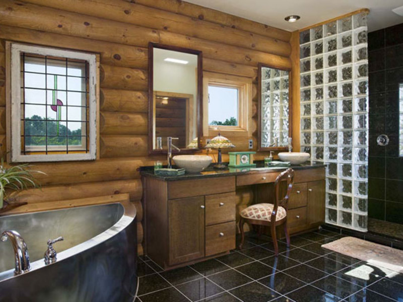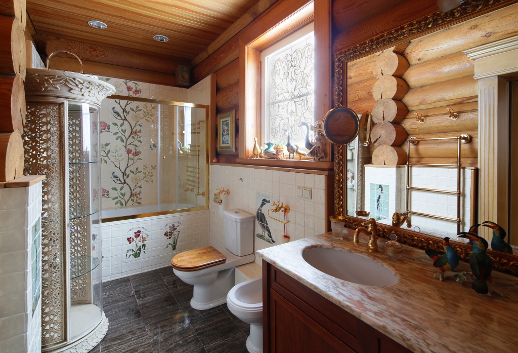 Les principes selon lesquels l'intérieur de la salle de bain est aménagé dans une maison de campagne en bois.