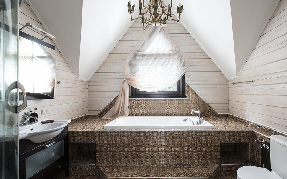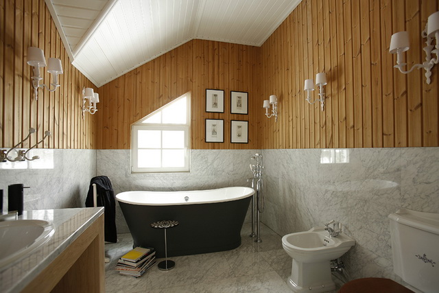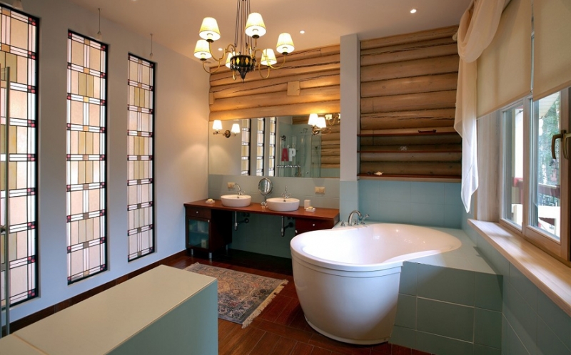 À l'intérieur du bâtiment, tout doit également être proportionné. Par exemple, il est souhaitable de terminer la baignoire dans une maison en bois en bois avec des carreaux, du bois d'essence résistant à l'humidité ou une gaine de revêtement. Les mosaïques carrelées sont installées sur une base spécifique, y compris des luminaires flottants.