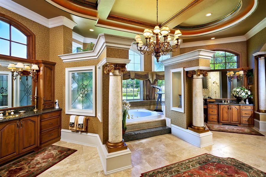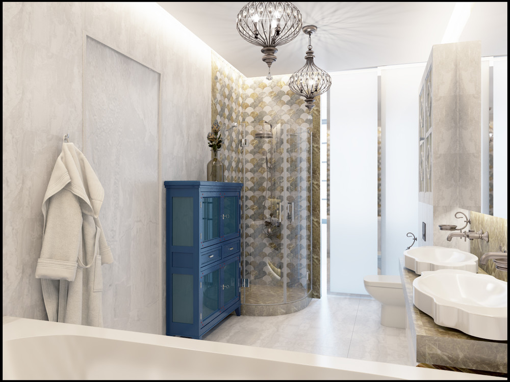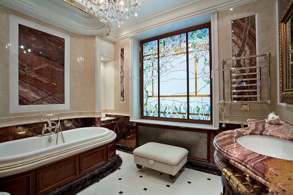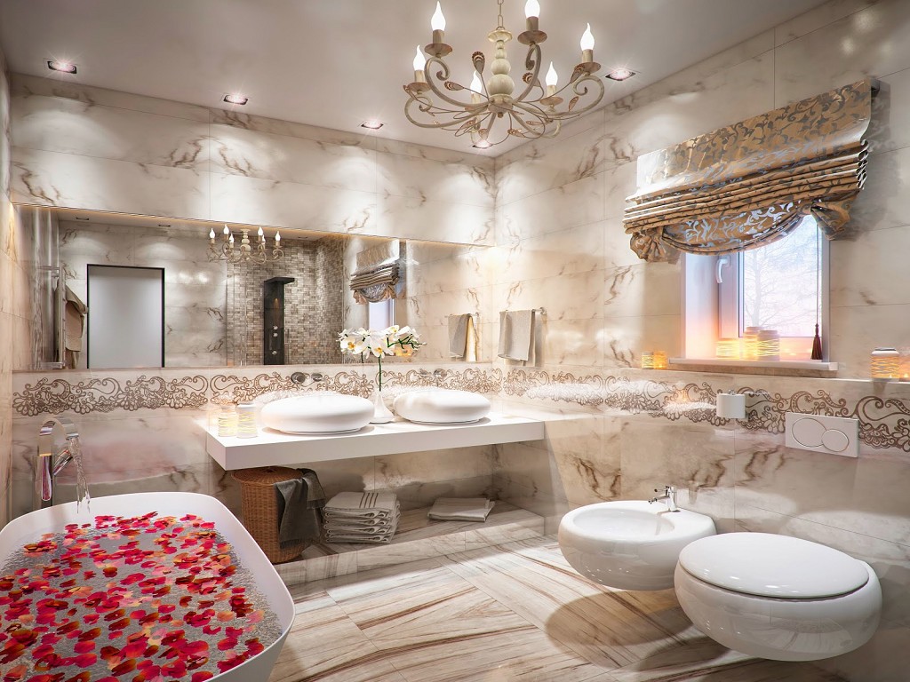 Cette conception dans la salle de bain de votre propre maison convient aux demeures luxueuses, dont les propriétaires ne peuvent pas économiser sur le confort. Ici, tous les détails intérieurs se distinguent par un brillant luxueux, un coût élevé et un look accrocheur. Souvent, des sculptures en bronze ou en argile, de la dorure, des appareils élégants sont utilisés.