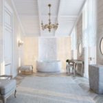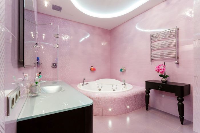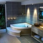 Il est très rare dans les maisons privées, et plus encore dans les appartements urbains de maisons préfabriquées, il est possible de trouver des salles de bain d'une superficie de plus de dix mètres carrés. Mais une telle salle de bain, bien sûr, offre beaucoup plus de possibilités pour la mise en œuvre de projets de conception. L'option la plus courante pour planifier une grande salle de bain est la division de la pièce en zones: invité et pour l'adoption de procédures d'eau. En termes simples, la zone réservée à l'évier et à la cuvette des toilettes s'élève au-dessus du sol et est parfois fermée par de minces parois en placoplâtre. La deuxième zone de baignade est également clôturée avec des murs en plaques de plâtre, de petites portes ou des écrans. Et il a une grande baignoire, une douche spacieuse, un lavabo et des placards pour ranger les serviettes, les peignoirs ou la literie. Dans les maisons privées, vous pouvez souvent trouver des salles de bains d'une superficie de plus de 10 mètres carrés. Il y a une place pour un jacuzzi et des bains de fantaisie. Ici, les propriétaires et les concepteurs de maisons sont absolument illimités, à l'exception des opportunités financières et de l'imagination. Considérez également plusieurs options d'éclairage. La principale source de lumière dans la salle de bain est le plus souvent un petit lustre, qui est installé au centre de la salle de bain ou plus près de la porte.