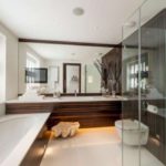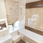 Les classiques Palace sont idéaux pour la décoration de salles de bains moyennes à grandes. Ce style est inhérent au luxe, à l'utilisation de revêtements muraux coûteux, de revêtements de sol. Les murs sont généralement décorés de mosaïques, le sol de carreaux de marbre. Les couleurs utilisées sont pastel, chaudes: marron clair, beige, blanc, crème.