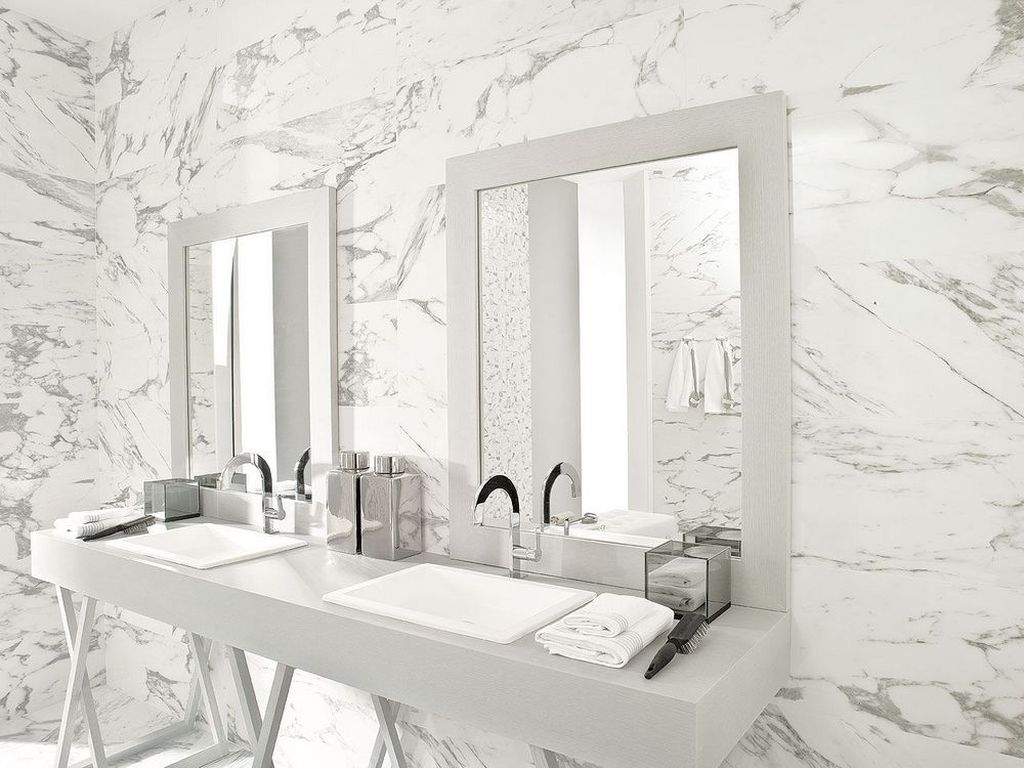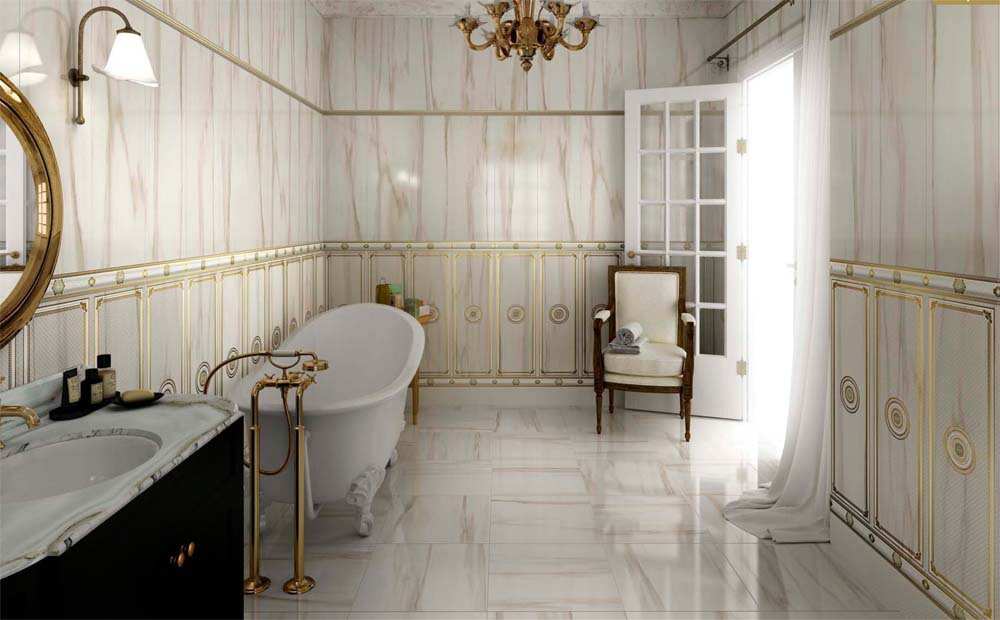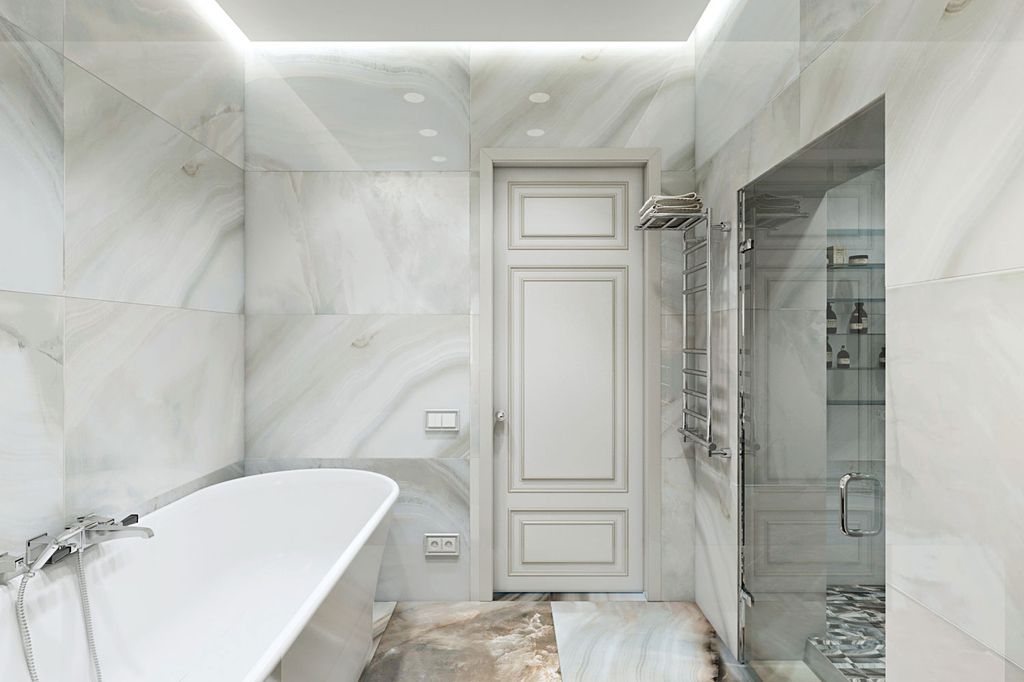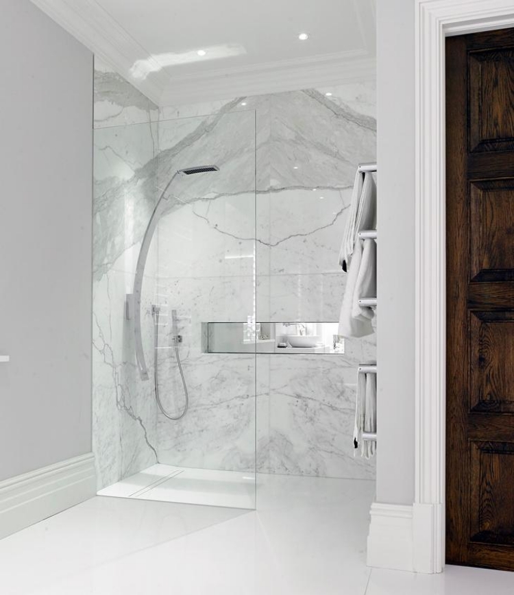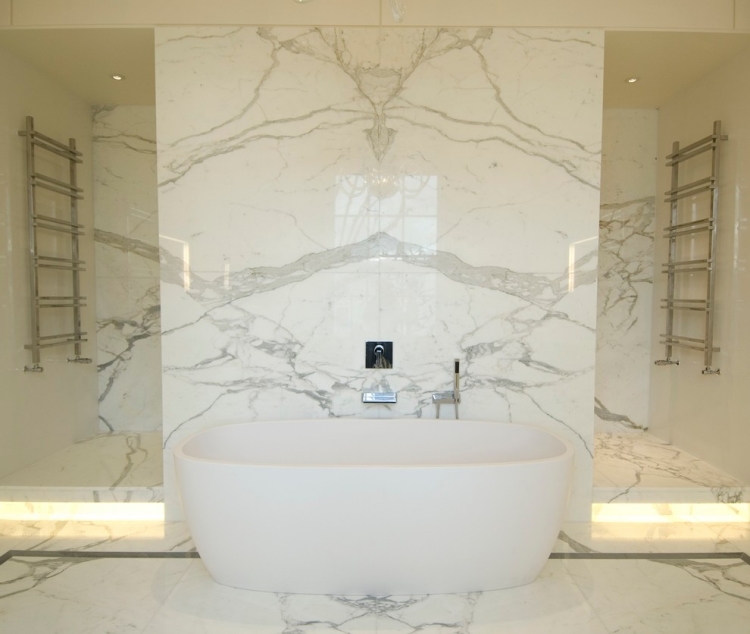 - Revêtement mural en marbre blanc pour une salle de bain de style classique