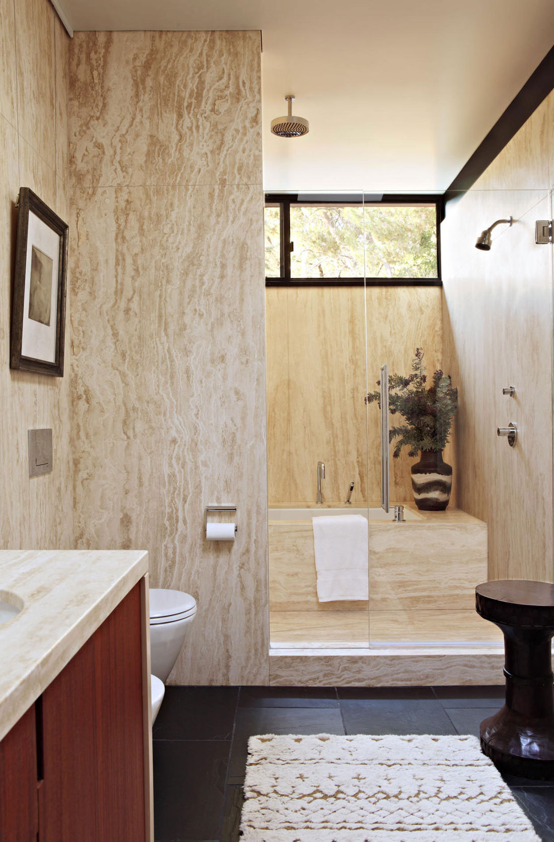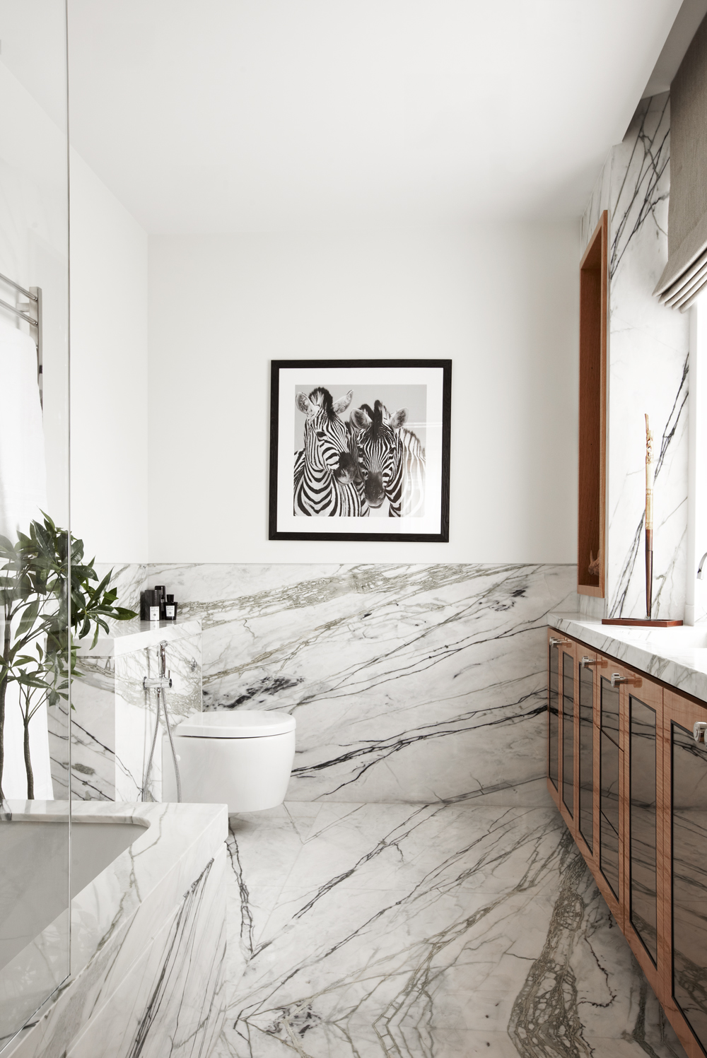 Lorsque vous utilisez du marbre et du bois dans la salle de bain, vous pouvez au contraire jouer en contraste. La chaleur du bois foncé ombragera la pierre froide et ajoutera des notes sophistiquées à l'intérieur monumental de la «pierre».