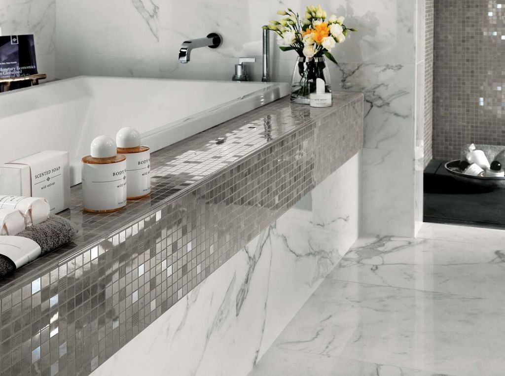 Remarque! Les carreaux de marbre blanc de taille moyenne peuvent être combinés avec n'importe quelle autre finition, que ce soit en forme, texture ou couleur.