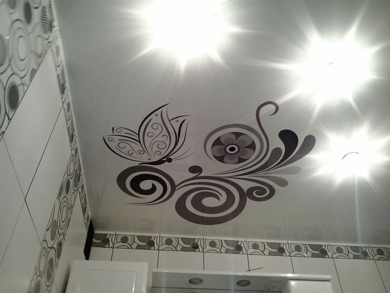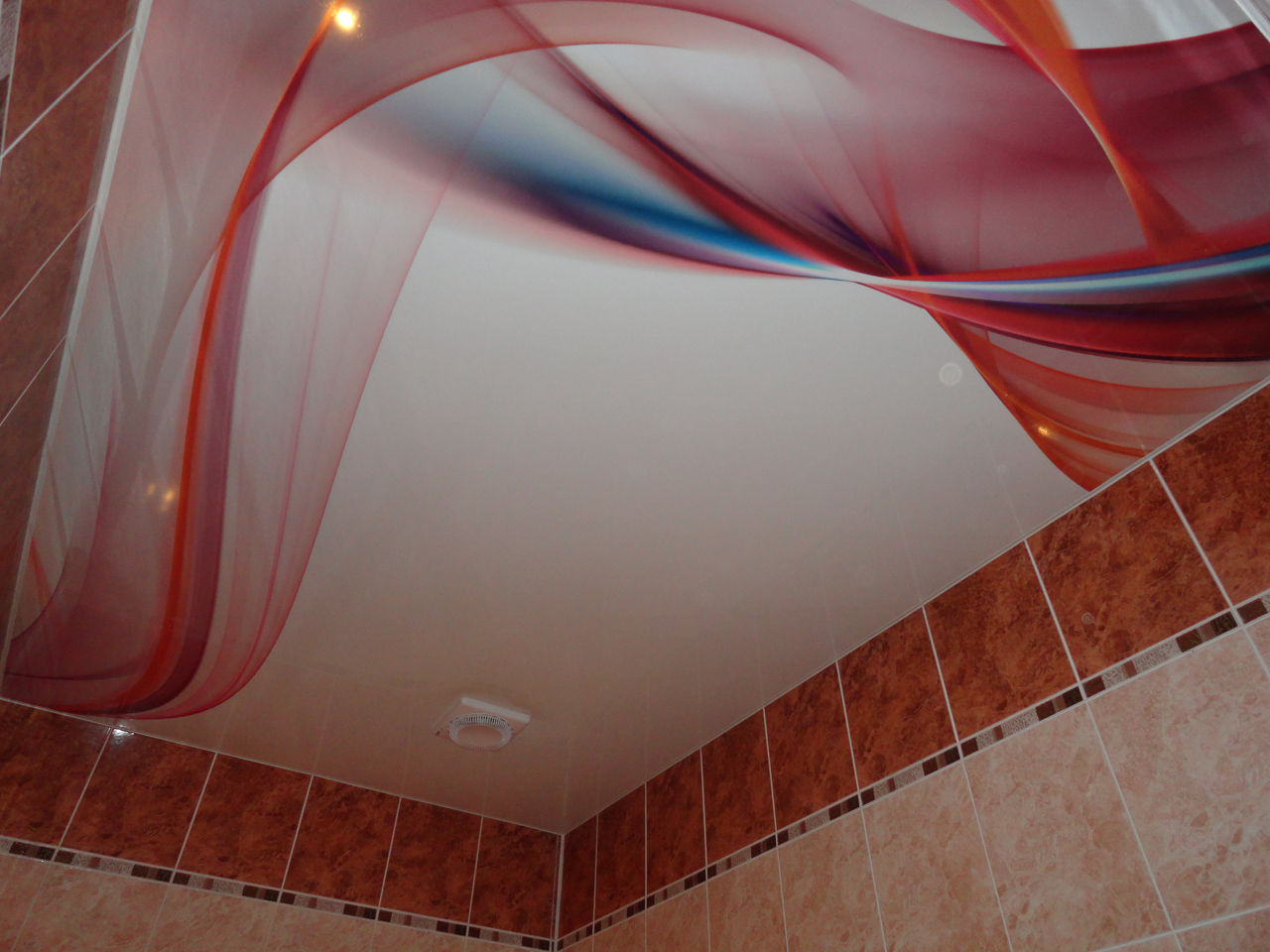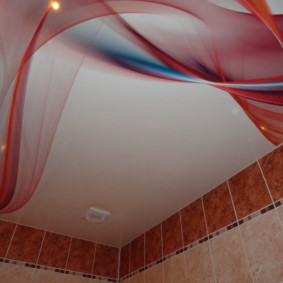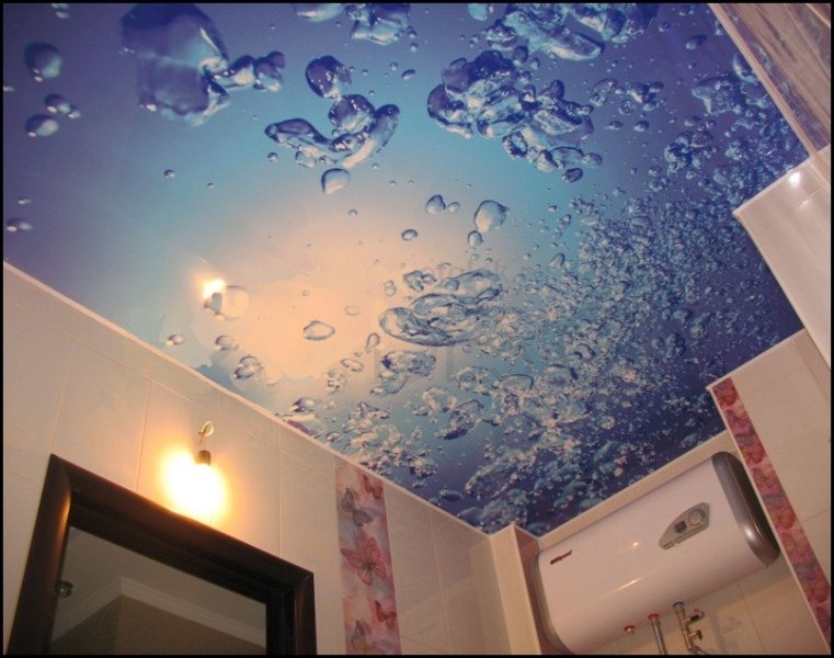 Une décoration lumineuse de la salle de bain sera la surface du plafond avec une impression photo réaliste