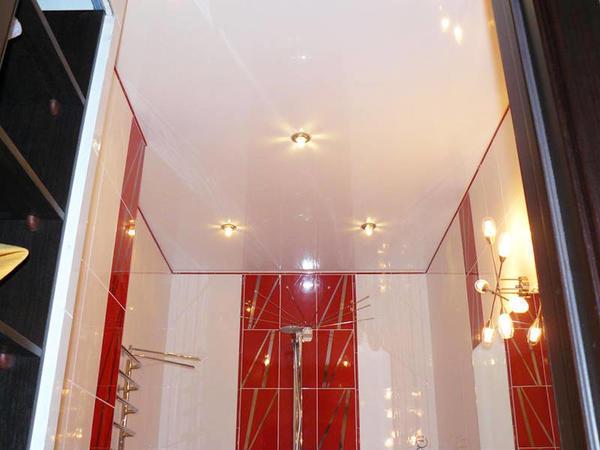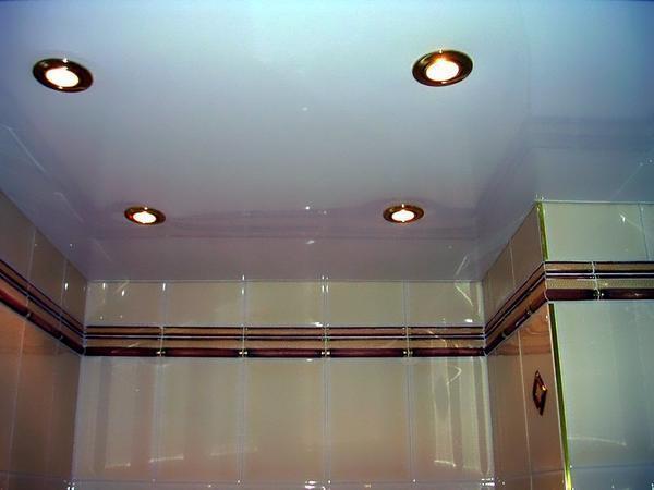 L'installation d'un plafond tendu dans la salle de bain offre un haut niveau d'isolation acoustique. Cette conception permet l'installation d'un éclairage ponctuel. Diffère en durabilité; la force; résistance à l'humidité, à la température, aux attaques chimiques et facilité d'entretien.