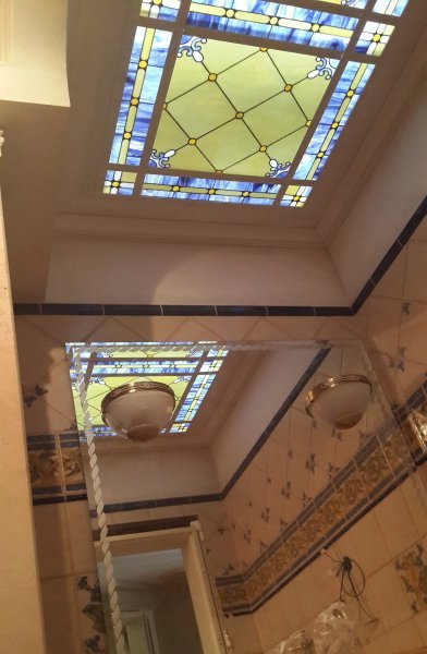 Le plafond en vitrail agrandit visuellement la pièce, se marie bien avec différents styles de design. L'inconvénient est le coût élevé du matériel lui-même et de son installation.