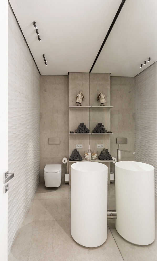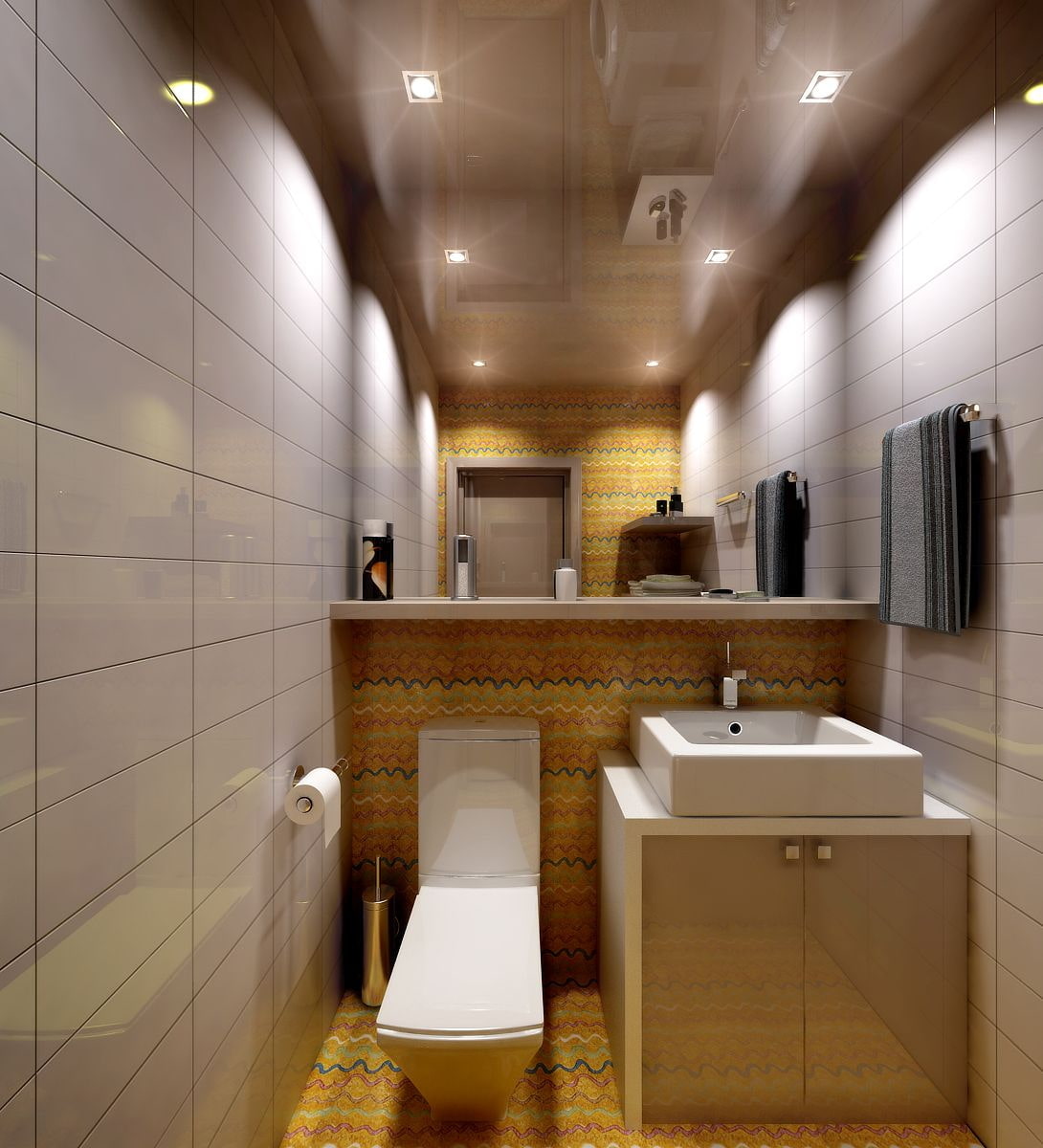 De plus, lors du choix des couleurs, il est nécessaire de prendre en compte non seulement le niveau du plafond, mais également son rapport avec les autres dimensions globales des toilettes: largeur et longueur.