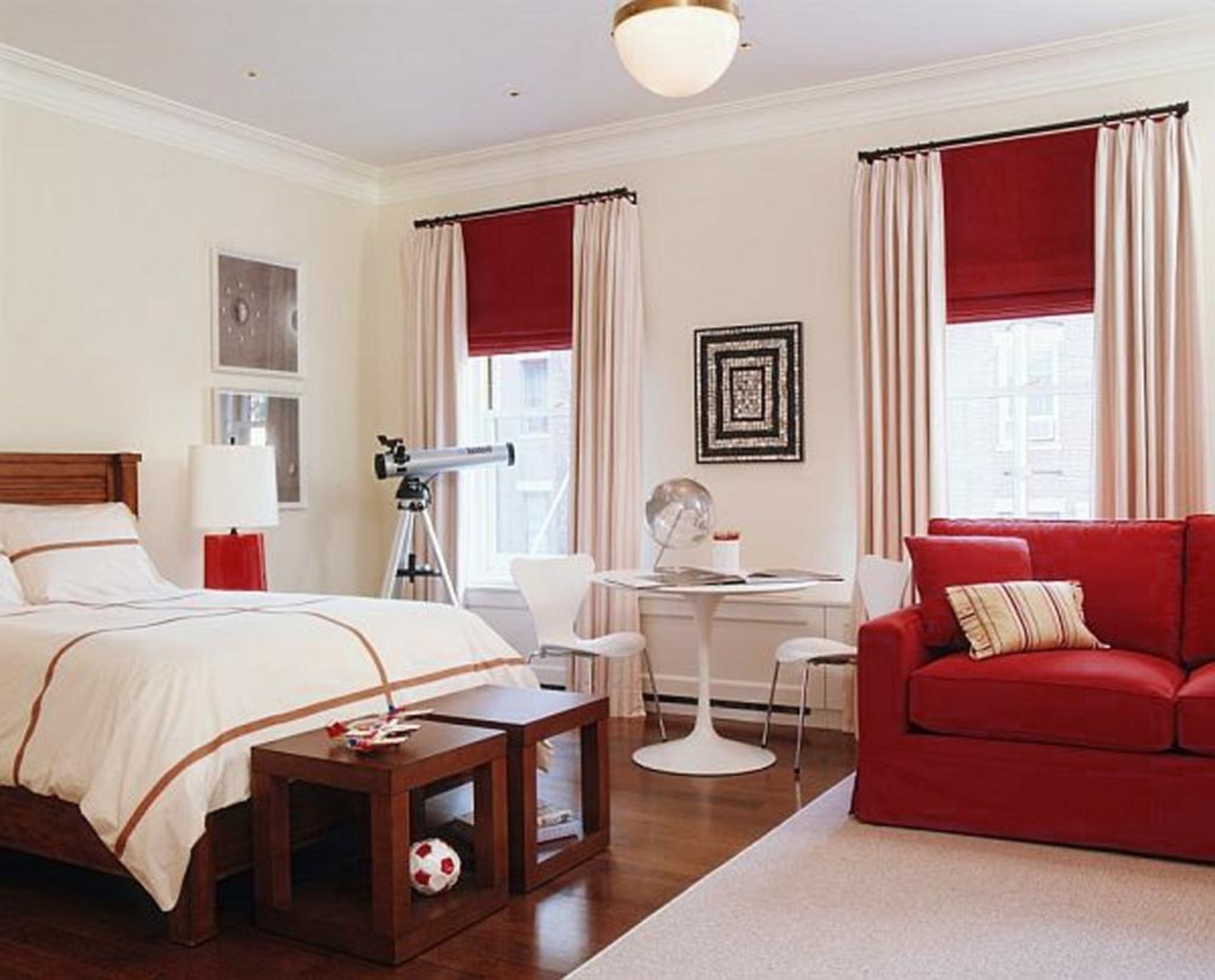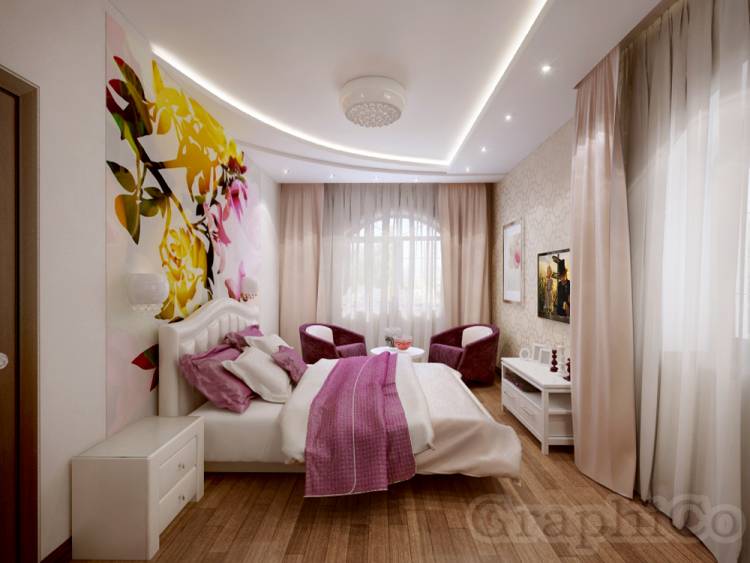Pour une telle chambre, deux centres sont utilisés - un lit et un endroit près des fenêtres.