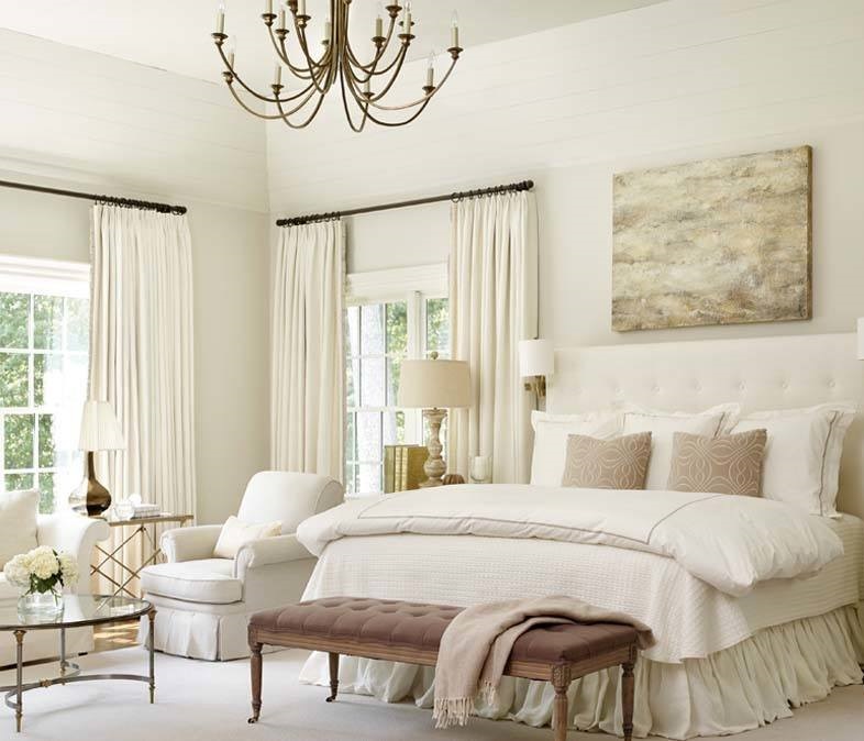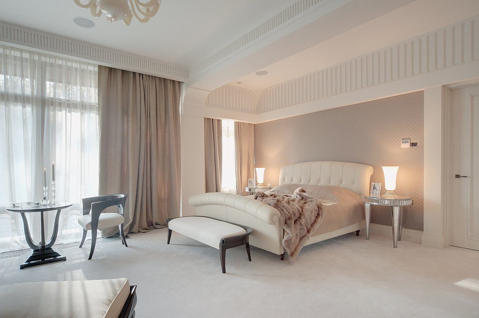 À première vue, il semble qu'il n'y a rien de plus facile que de planifier un intérieur en blanc, mais il y a aussi des pièges ici. Il y a tellement de nuances de blanc. Ils sont chauds - crème et vanille, et ils sont froids, avec une touche d'argent ou de bleu. Dans tous les cas, il vaut mieux choisir une couleur avec une légère teinte pour l'intérieur du salon afin qu'elle n'irrite pas les yeux. Le plus souvent, la conception de la chambre utilise des tons neigeux, ivoire, antique, fumé, lin, perle, lait cuit.