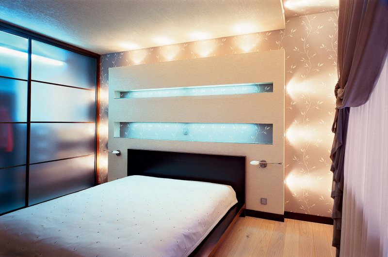Pour les petites chambres, une palette d'au moins trois couleurs est sélectionnée. Un éclairage naturel et artificiel suffisant est apprécié. Pour économiser de l'espace, les luminaires sont montés directement dans le mur ou le plafond, ce qui économise de l'espace et garantit l'éclairage de la pièce.