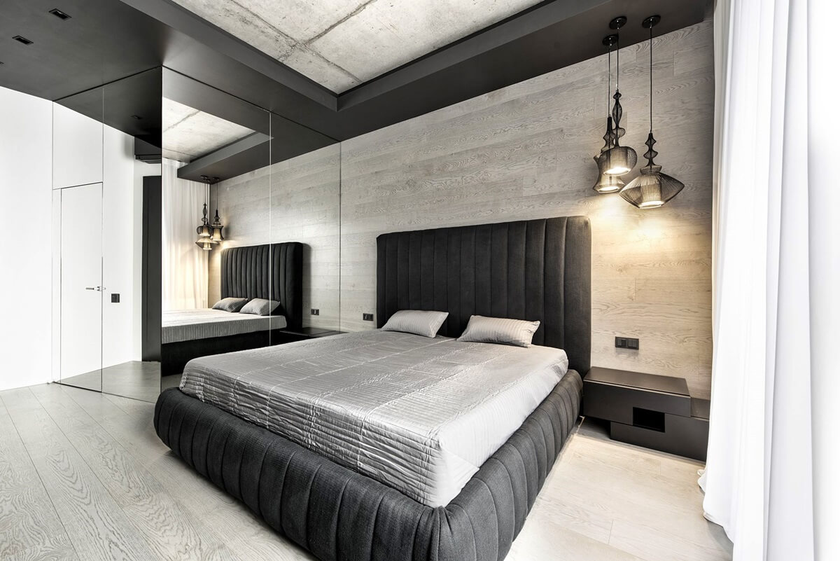 - Palette de couleurs. Le gris, le noir et le blanc sont trois baleines sur lesquelles le concept général de conception est «érigé». Bien que le style permette l'utilisation d'accents lumineux, mais exclusivement à "petites doses", par exemple, des coussins de canapé lumineux, ou un grand vase de couleur contrastante.