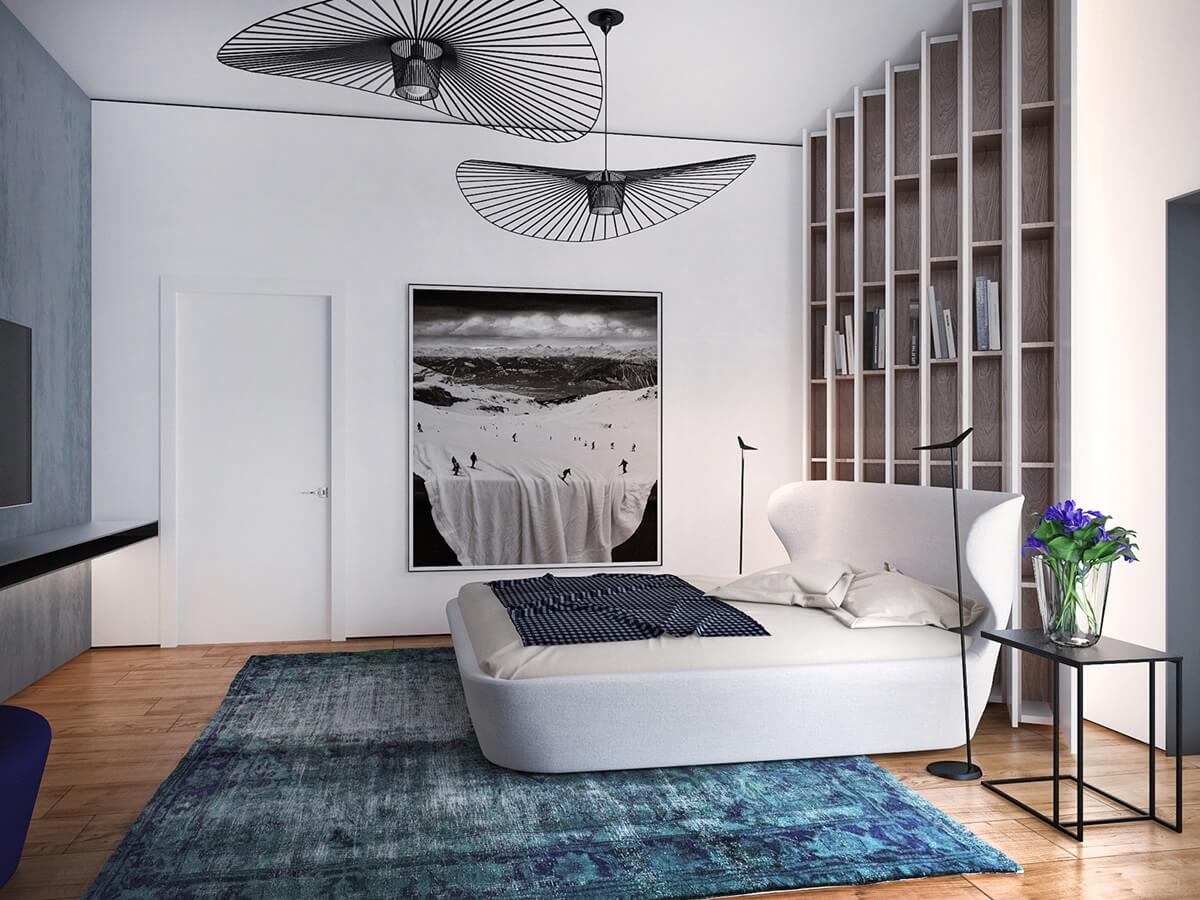 En plus de la conception globale de la chambre, les murs sont conservés dans des tons neutres et calmes. Comme déjà indiqué, les couleurs vives sont "dosées" de manière dosée et uniquement sous forme d'accents. Et c'est la palette de couleurs laconique qui rend ces accents plus vifs et intéressants.