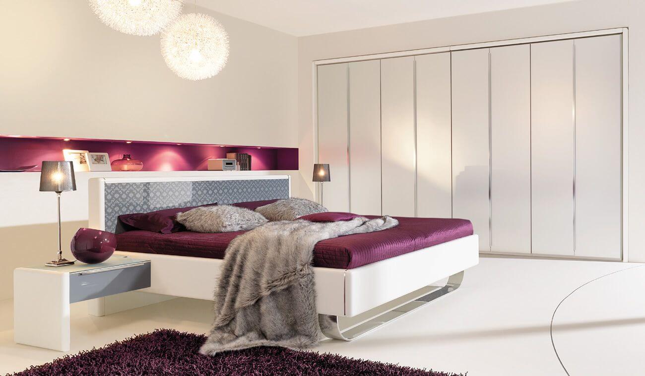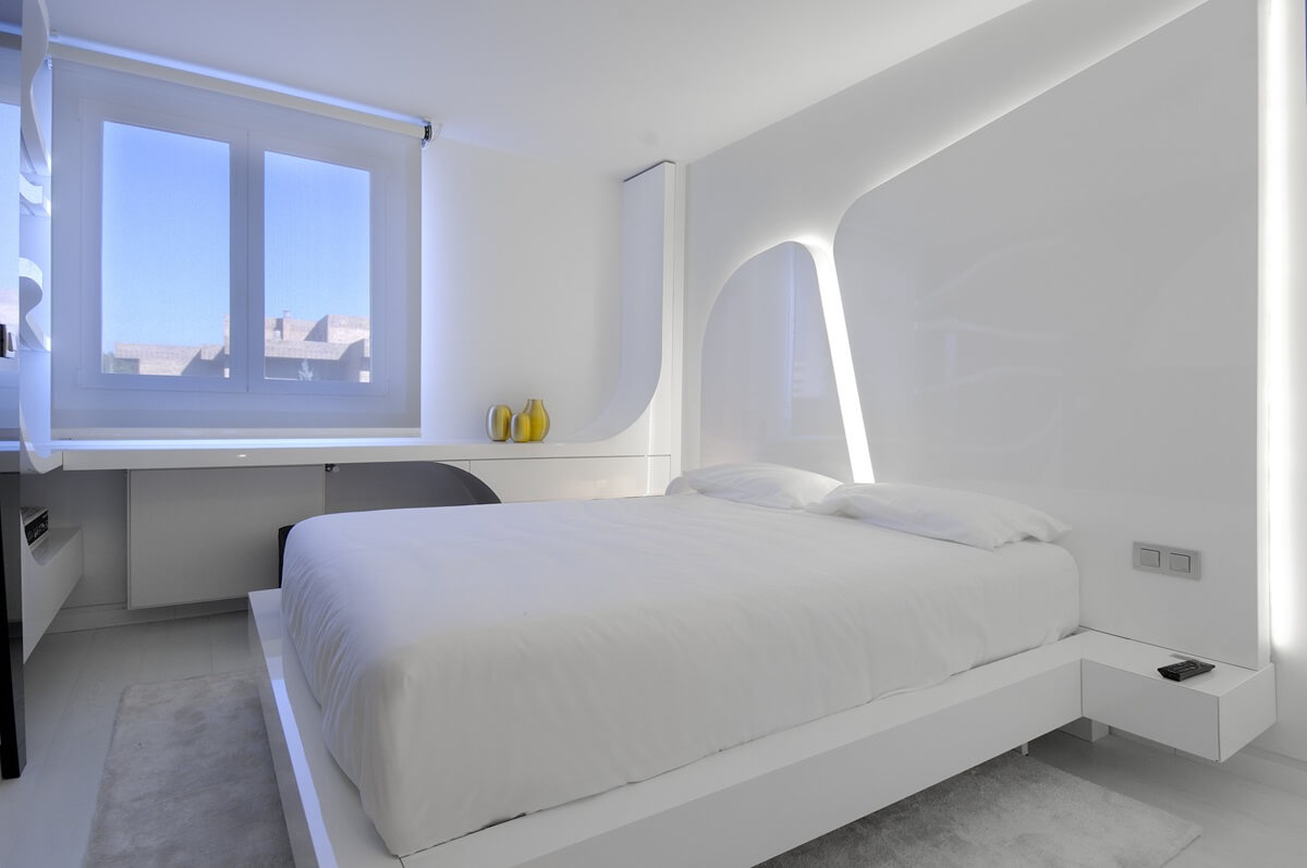 Le mobilier doit être aussi simple et pratique que possible: des lignes claires et des formes primitives. Lorsque vous choisissez le nombre d'articles d'intérieur, n'oubliez pas qu'il devrait y en avoir un minimum dans la haute technologie. Pour une chambre, un lit, une table de chevet, une armoire et une paire de fauteuils deviendront un tel ensemble. Les tables de chevet jumelées situées des deux côtés du lit sont un concept dépassé.