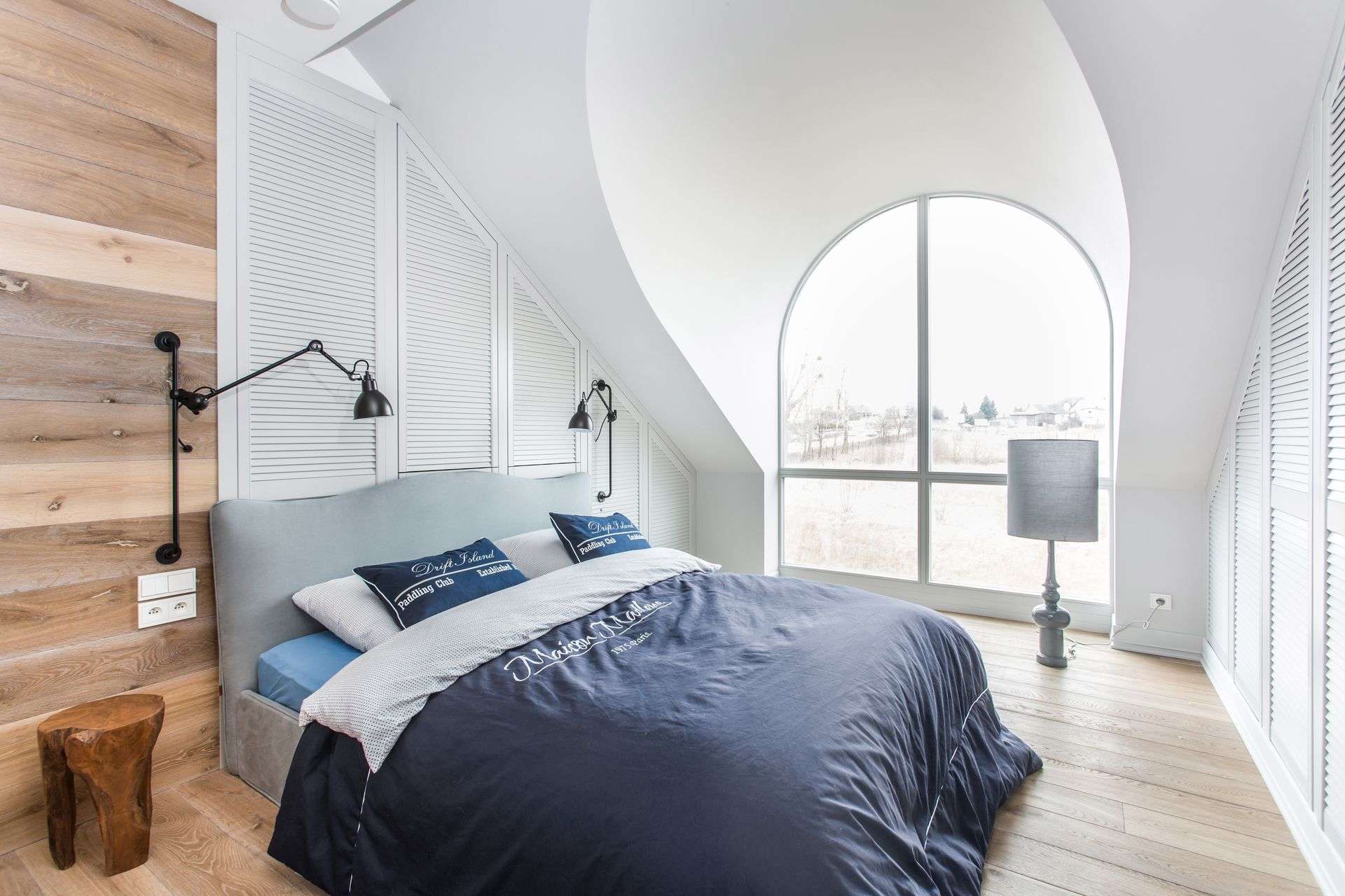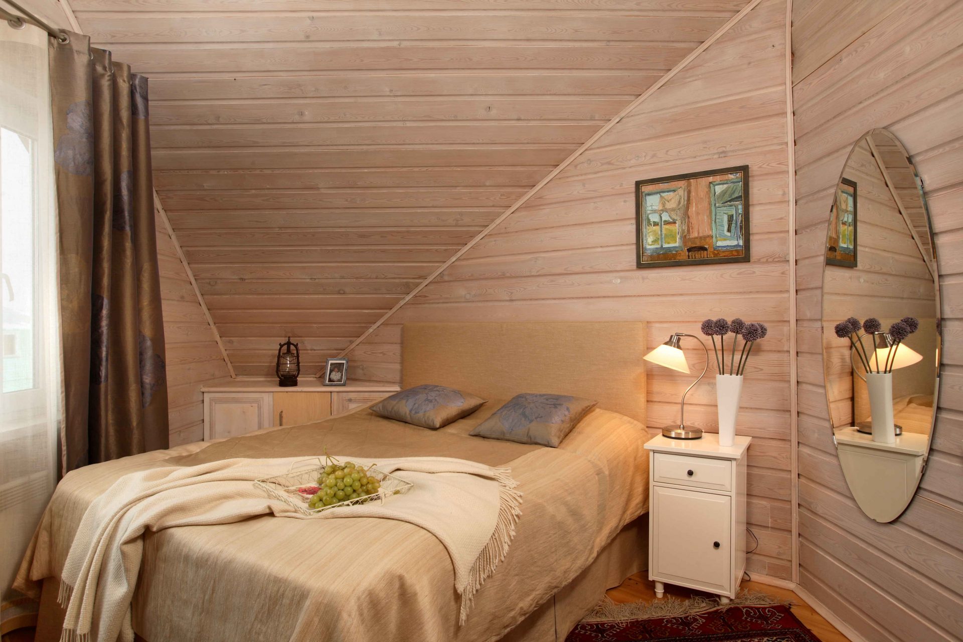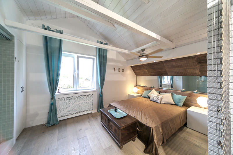 - La géométrie du toit vous permet de concevoir même le plafond. Si la fenêtre est droite et classique, il est préférable de privilégier les rideaux épais.