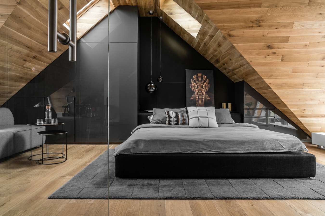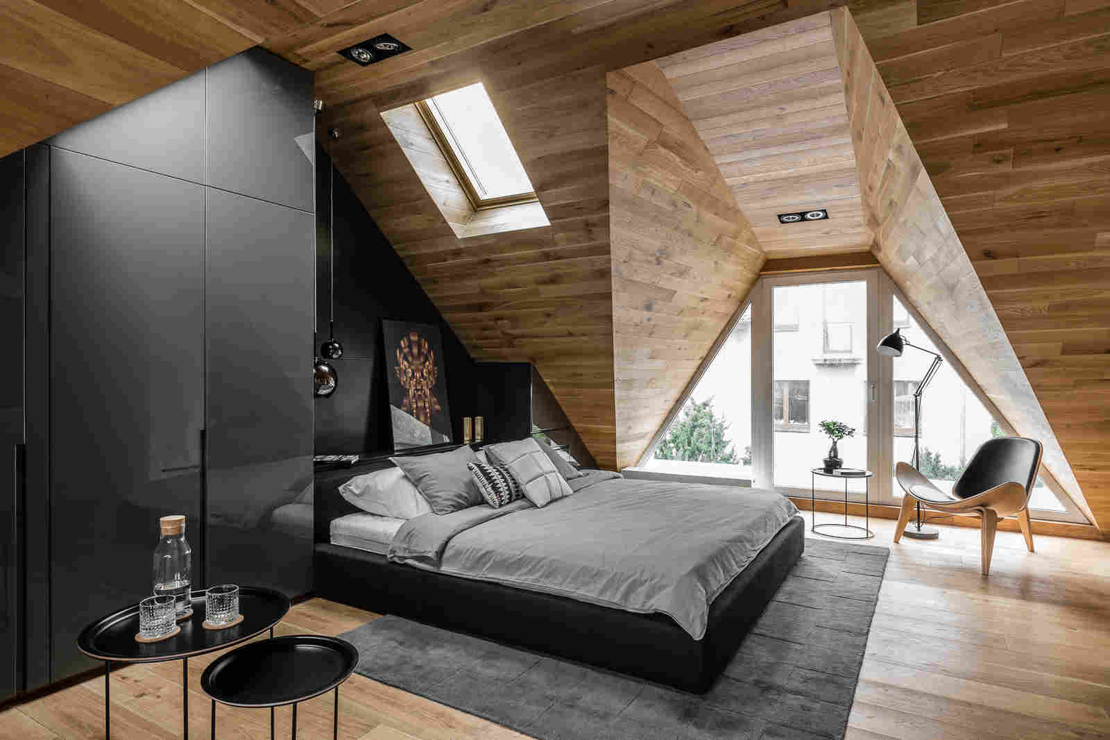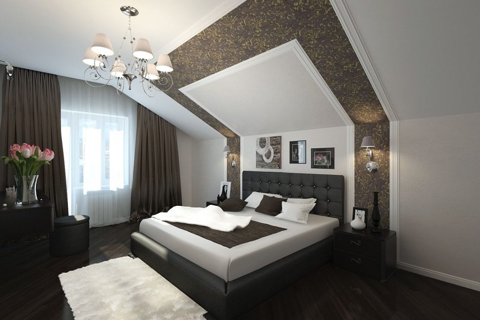 Le design de la chambre dans le grenier de taille considérable et avec de grandes fenêtres peut être décoré dans des couleurs sombres, avoir un sol sombre.