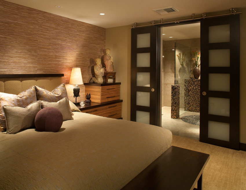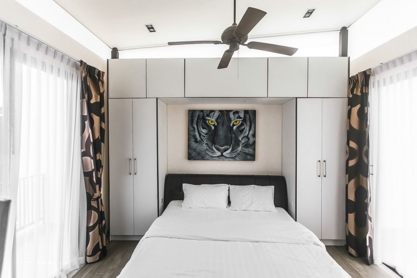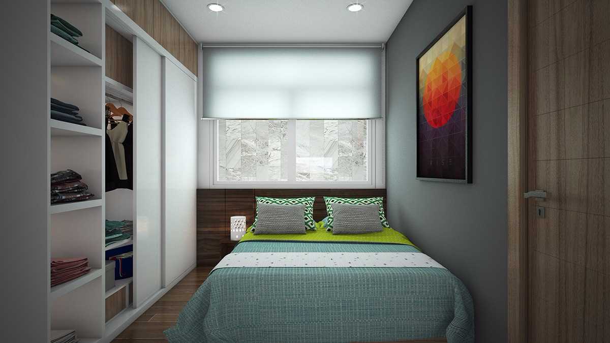 Chambre conjugale minimaliste, qui utilise un système moderne avec des portes coulissantes pour ranger les choses, occupant complètement l'un des murs aveugles