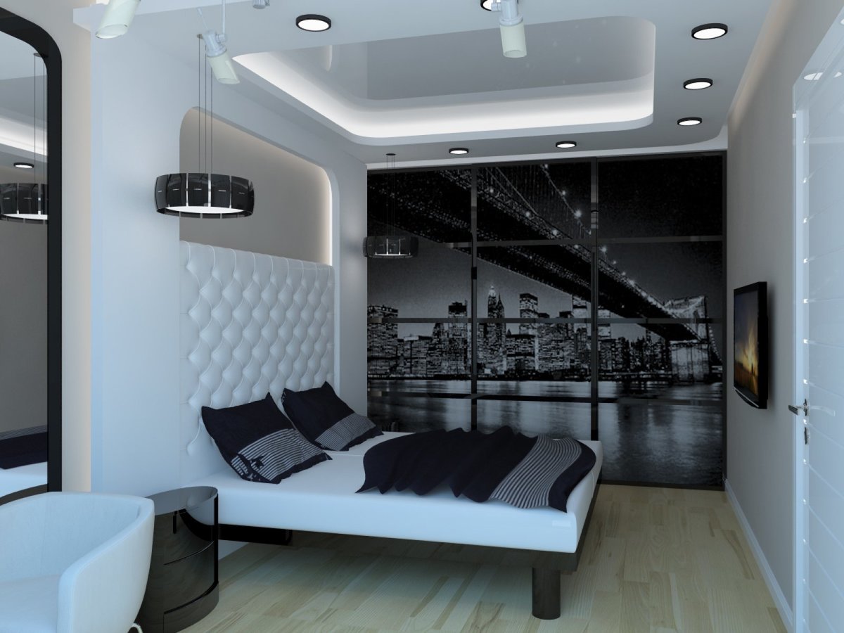 Pour une utilisation intérieure en blanc, choisissez des meubles aux couleurs vives et le lit peut être décoré avec de l'éco-fourrure. L'intérieur sera décoré d'un miroir mural dans un cadre en argent métallique, de lampes soignées dans un style moderne et neutre, de peintures et de photographies en noir et blanc.