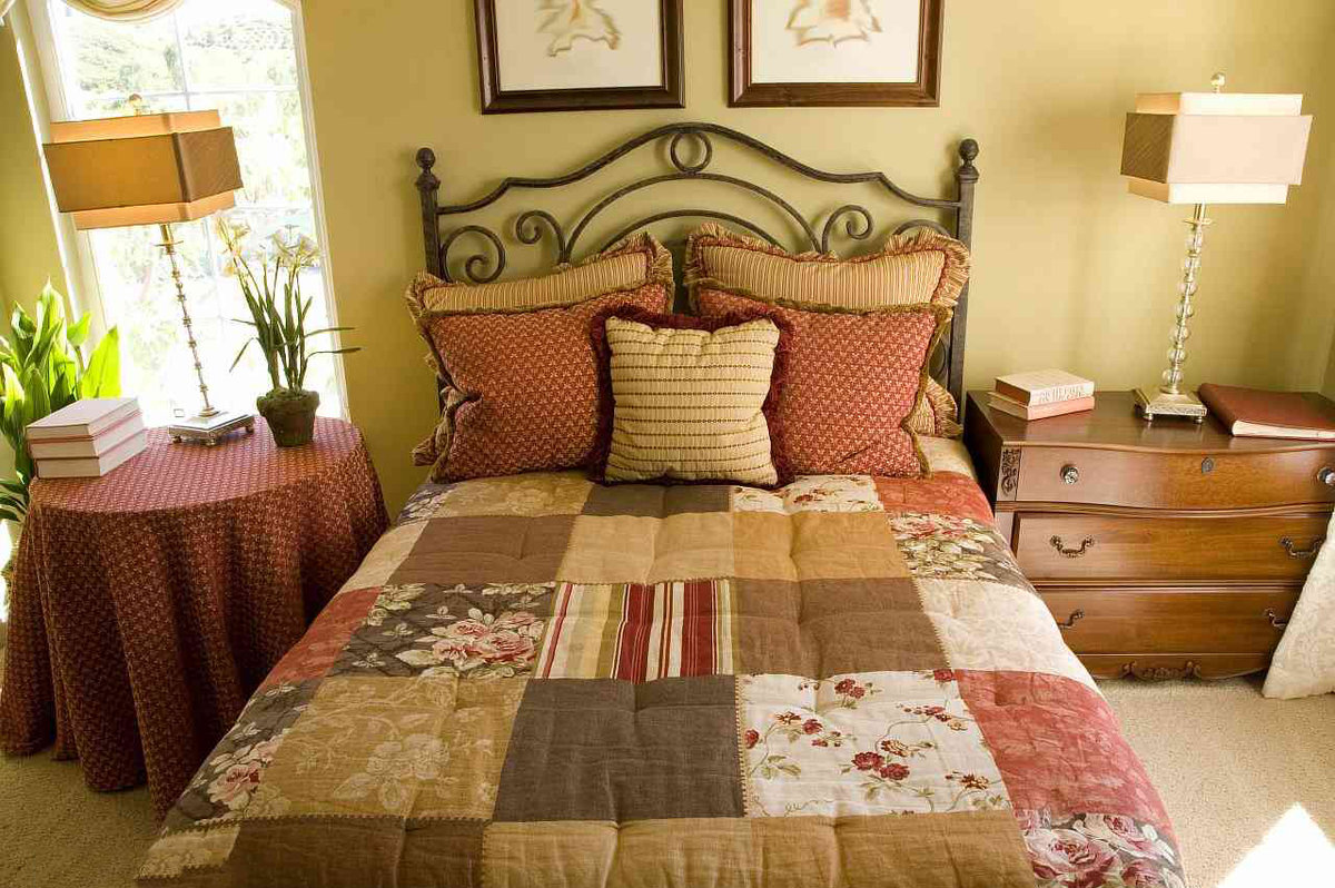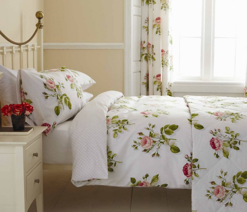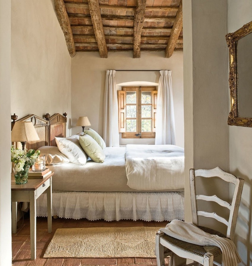 Pour décorer une chambre de style champêtre, utilisez des textiles et des fleurs fraîches.