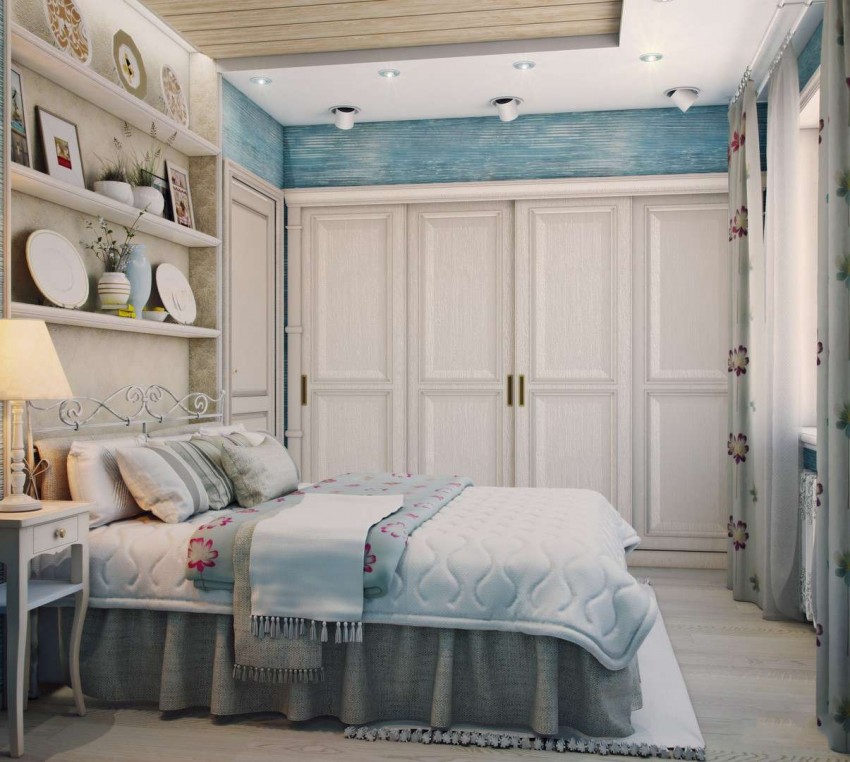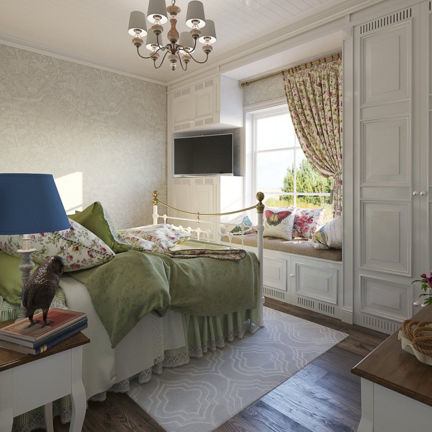 Afin de ne pas rendre la pièce trois à trois encore plus petite, il est recommandé de choisir des meubles compacts en bois clair décorés de sculptures et de cadres. Les textiles doivent être sélectionnés dans des couleurs claires, en petits caractères, par exemple des pois, une cage de vichy, une fleur.