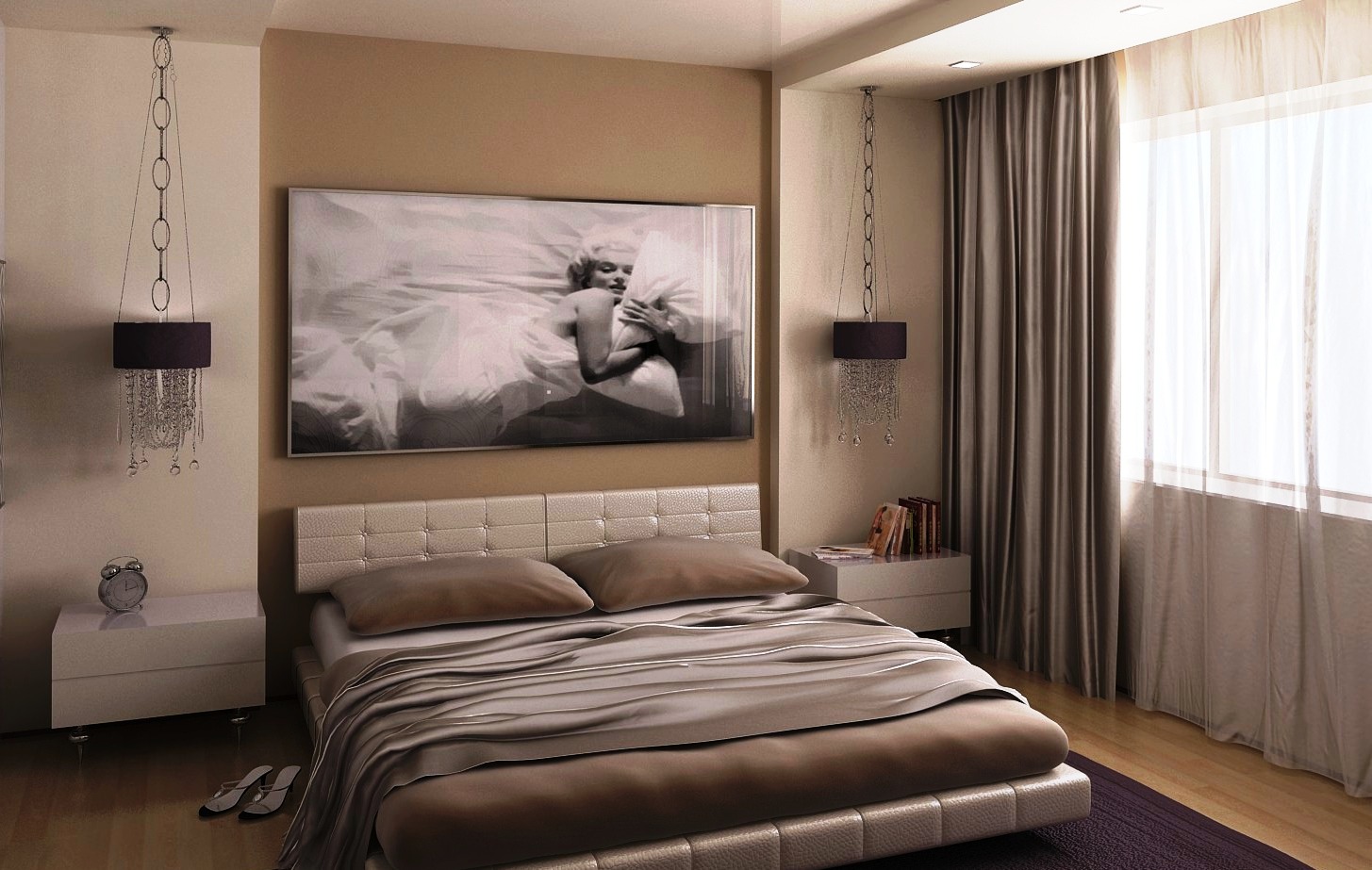 Le design monochrome implique l'utilisation de plusieurs nuances de la même couleur dans le même concept de design. Dans le cas d'une chambre beige, vous devez faire attention à ces nuances: