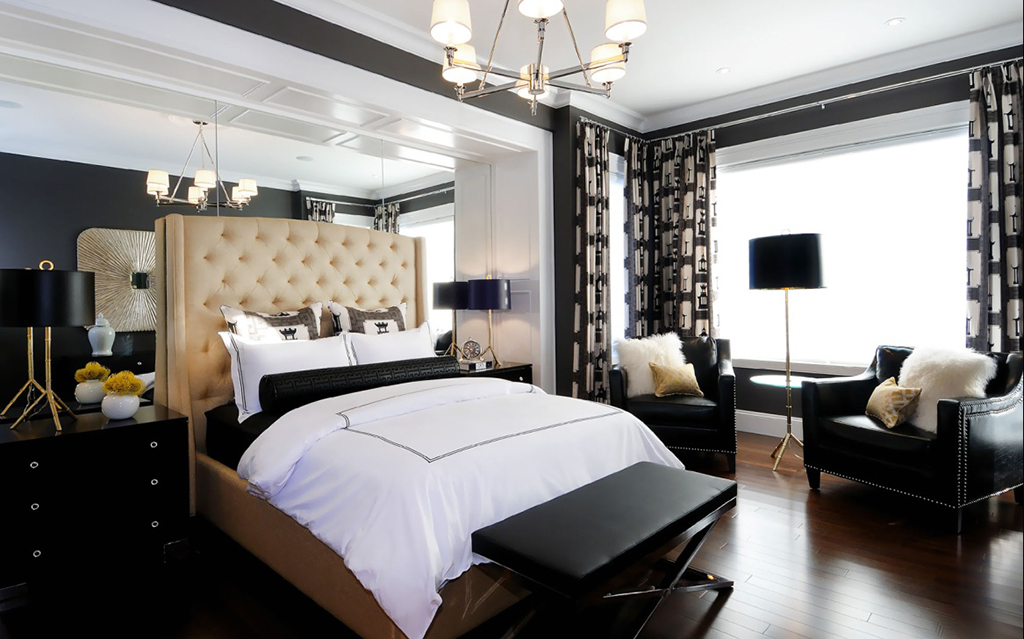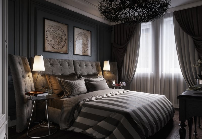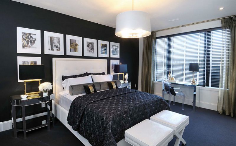 - Créez des accents. Il est obligatoire d'utiliser du noir, du violet, du bleu, du rouge foncé, du vert malachite et d'autres couleurs saturées pour les détails d'accent. Rideaux, tapisserie d'ameublement, un mur noir à la tête du lit - les accents lumineux donnent le style de complétude.